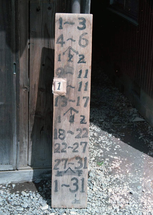 Voici la fameuse planche qui accompagnait nos entraînements au san ju ichi no jo à Iwama, il y a plus de trente ans déjà. Elle fut une aide précieuse pour des centaines d’uchi deshi au fil des années, et a été prise en photo bien des fois. J’espère que quelqu’un l’a préservée après la mort de maître Saito et lui a évité de finir au feu, en remerciement de ses bons et loyaux services.