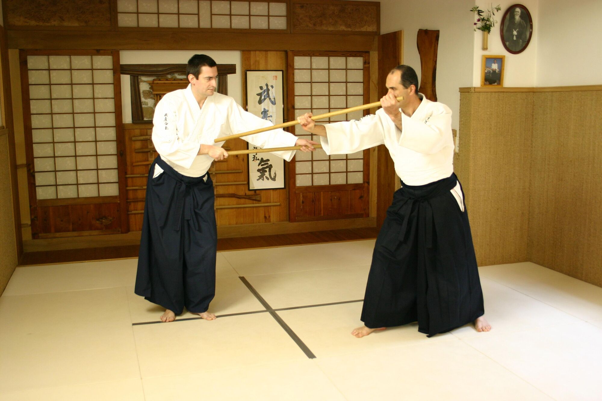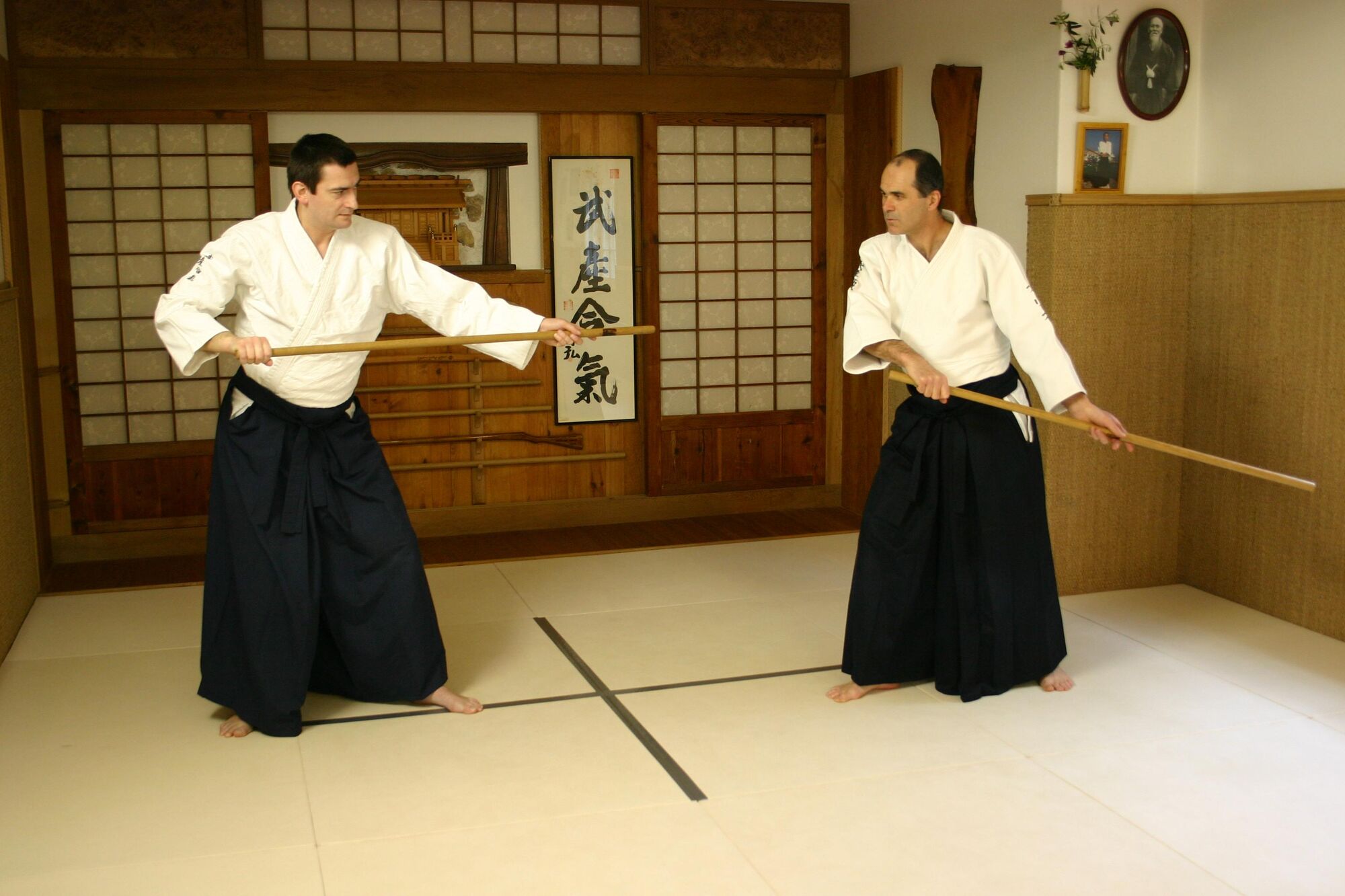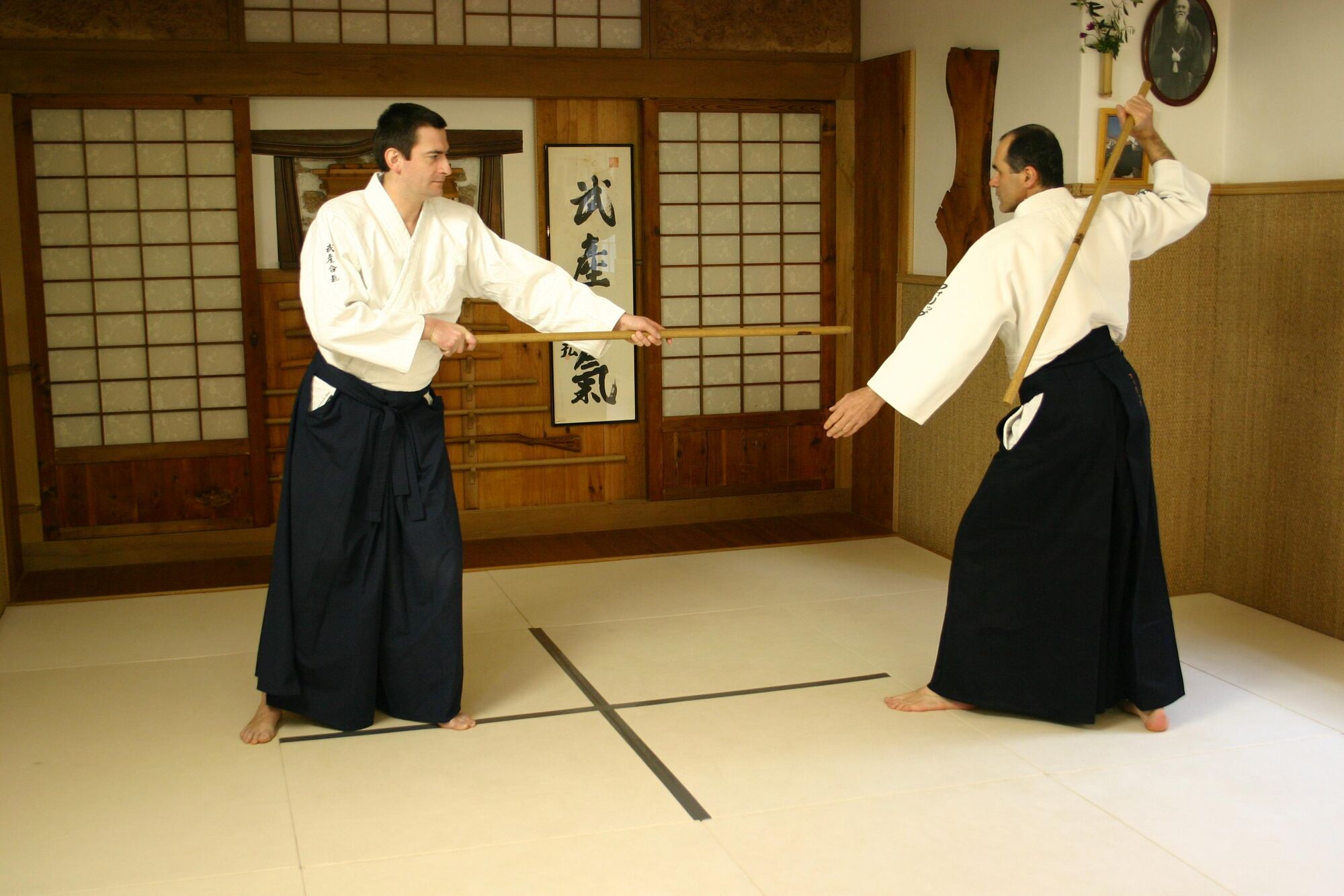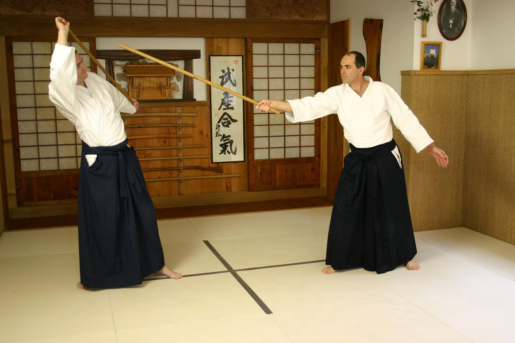 Uchi jo : effacement du corps en portant le jo au dessus de la tête dans la ligne des épaules. Attention à ne pas laisser le bras gauche dans l'axe de l'attaque, ce qui découvrirait votre tête et exposerait votre main gauche.