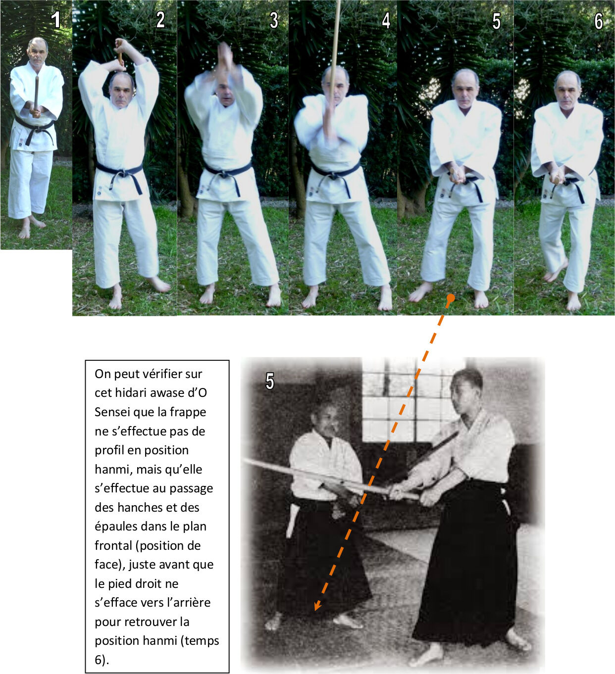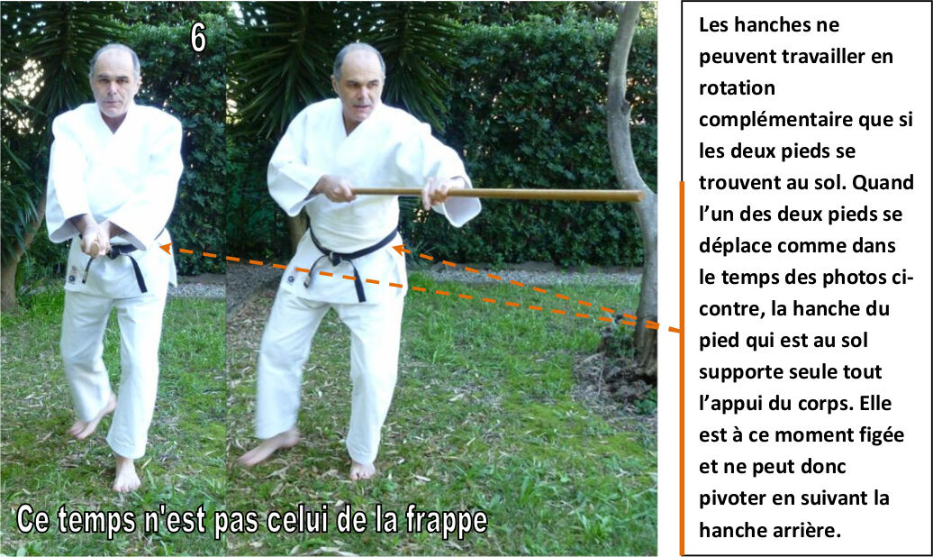 Le temps 6 n’est pas celui de la frappe car à ce moment la frappe est déjà terminée, le temps 6 est celui du retour à la position hanmi (hidari hanmi ici) :