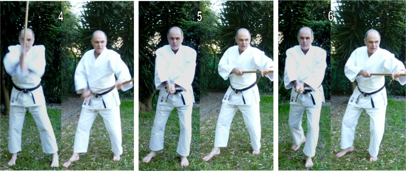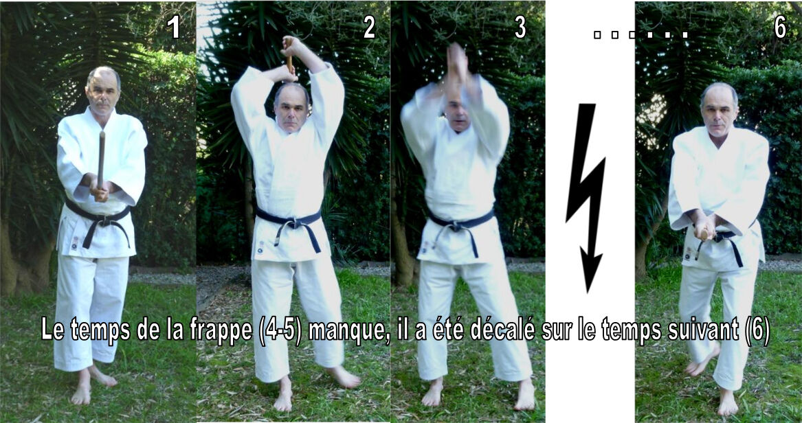 La connaissance du temps de la frappe (4-5) qui manque, a été perdue après O Sensei, ce temps a été décalé sur le temps suivant (6). Et nous butons une nouvelle fois sur le problème déjà relevé pour hidari awase au jo, dans Aiki jo #1 : dans un tel cas, la frappe ne s’effectue plus grâce à la rotation des hanches, mais par le seul effacement de la hanche droite vers l’arrière. Or cet effacement est incapable de délivrer une puissance quelconque.