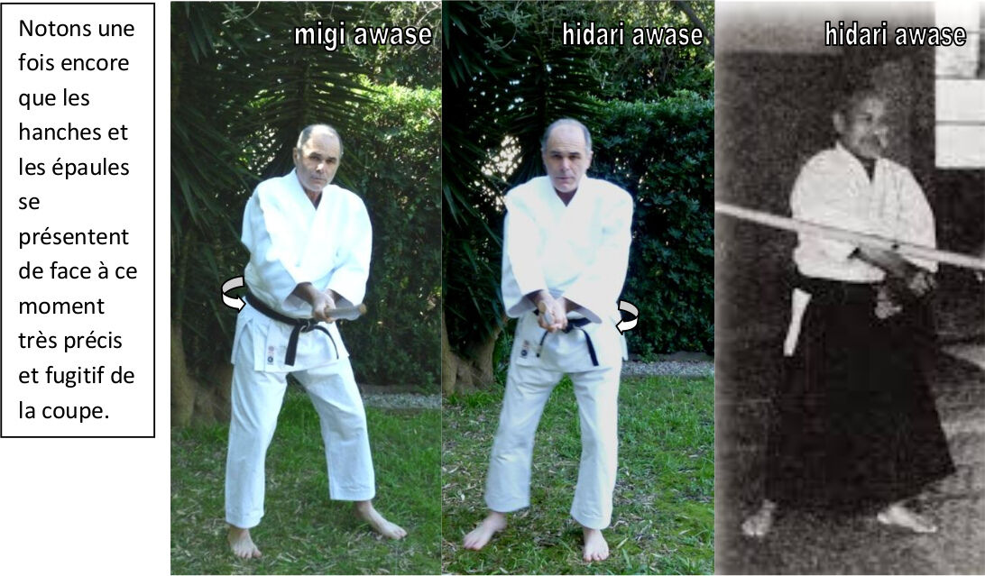 - Hidari awase : la hanche directrice de la coupe est la hanche gauche, la poussée part de la jambe gauche.
