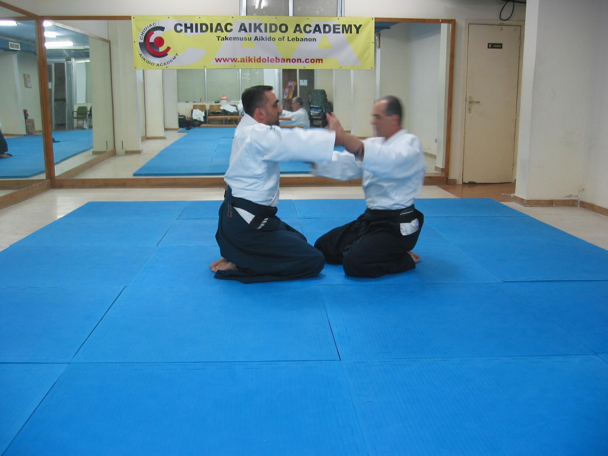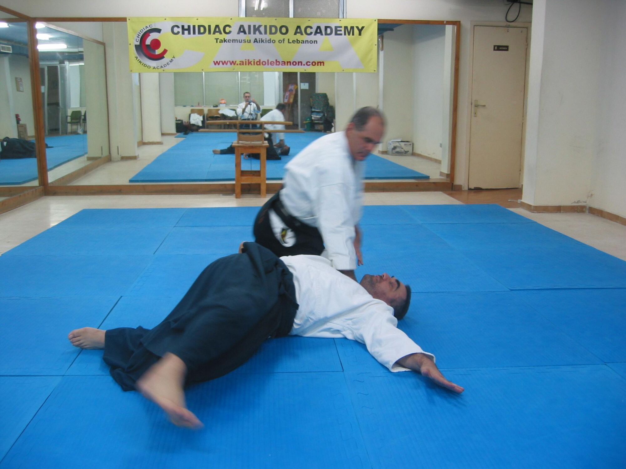 Saisissez le col d’uke et son poignet et poussez dans son déséquilibre. Amenez au sol en pivotant, maintenez la saisie du col.