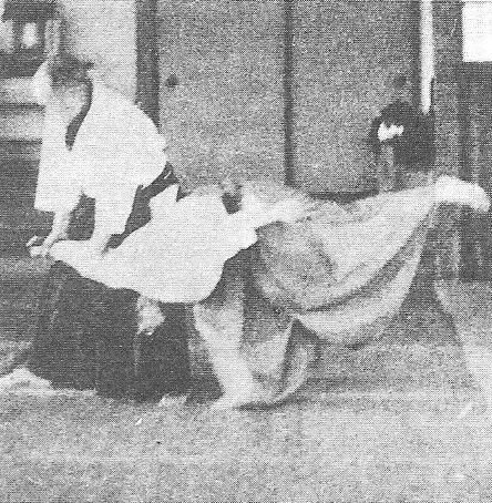 On voit bien, sur les deux photos ci-dessus du livre Budo, qu’O Sensei, après être entré sur l’arrière droit d’uke, pivote à 180° grâce au déplacement irimi-tenkan, pour amener ce dernier dans son déséquilibre avant droit.