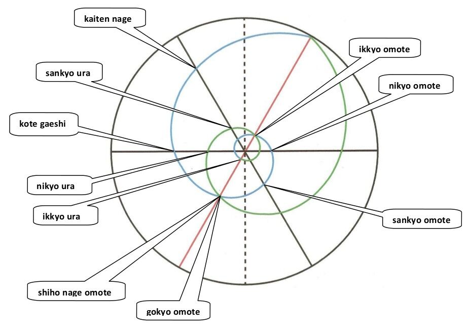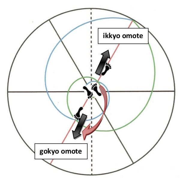 On constate immédiatement que l’angle de gokyo est aussi l’angle de shiho nage et l’angle d’ikkyo ura, c'est-à-dire l’angle symétrique à 180° d’ikkyo omote (cf kajo #4).