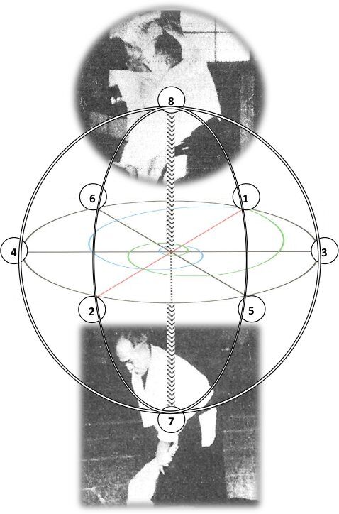 3 - Sur les lignes ikkajo, nikajo, sankajo et gokajo, les techniques sont opposées de part et d’autre, mais jamais sur la ligne. En revanche, la ligne yonkajo se confond avec l’axe de rotation sur lui-même de l’ellipsoïde de révolution de l’Aikido, et yonkyo et tenchi nage s’effectuent sur cet axe même.