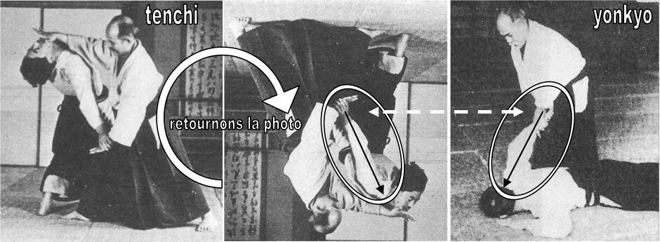 C’est de la même manière exactement, dans les deux techniques, que le bras et l’épaule d’uke sont sollicités, et c’est pourquoi uke doit ressentir la même chose dans un cas comme dans l’autre: tenchi nage est un yonkyo vers le Ciel, yonkyo est un tenchi nage vers la Terre. C’est le sabre à double tranchant du Ciel et de la Terre.