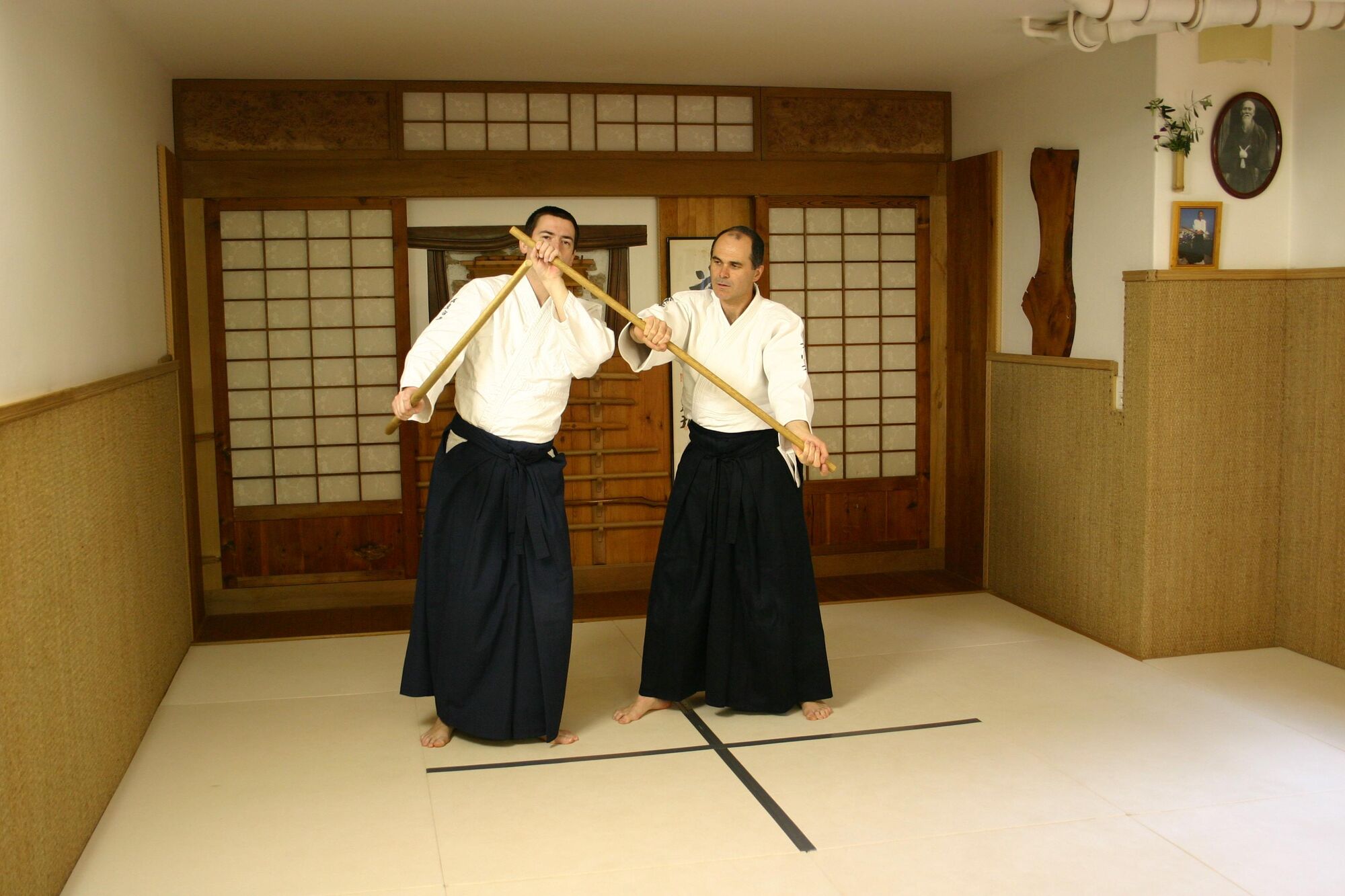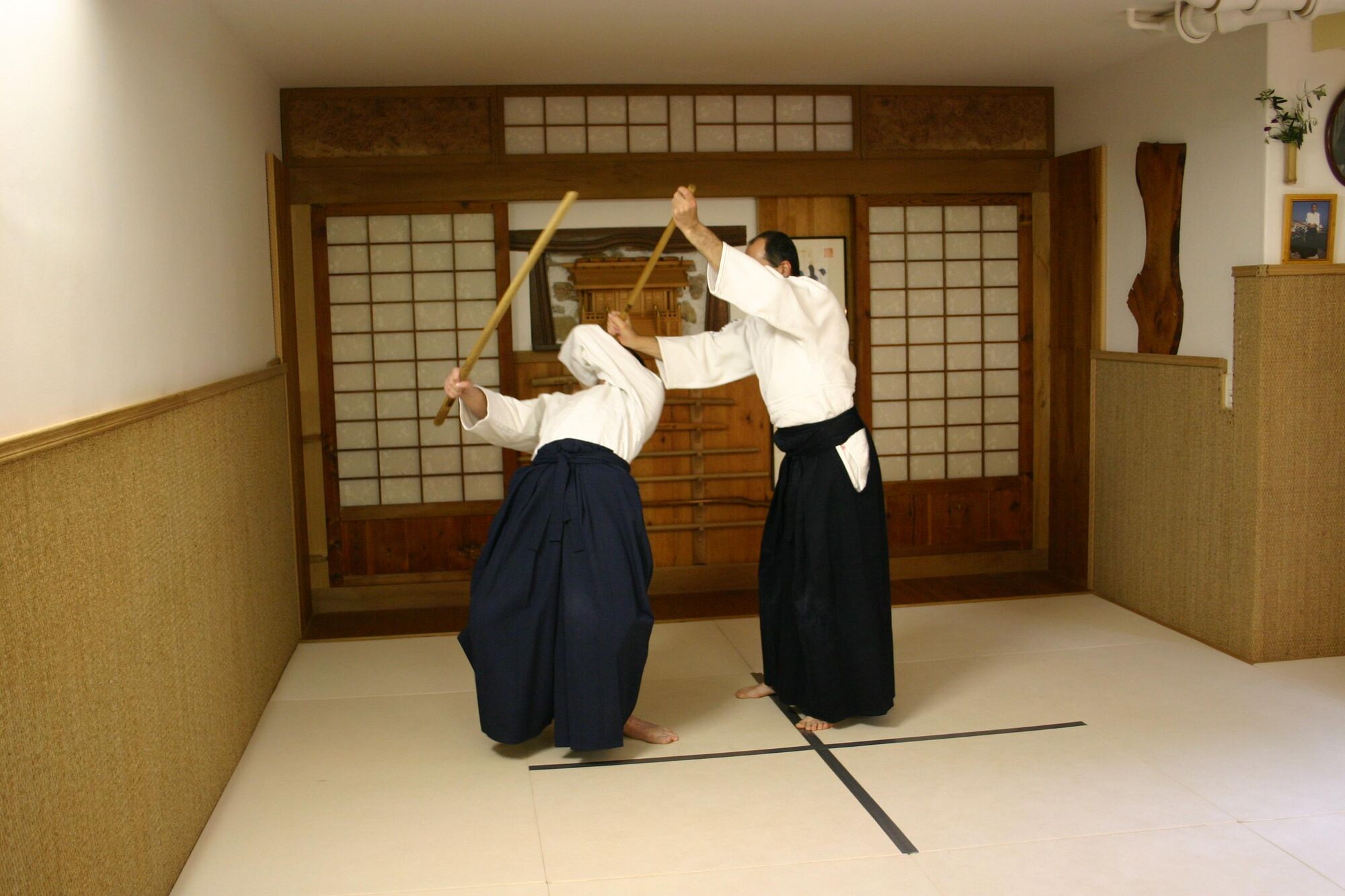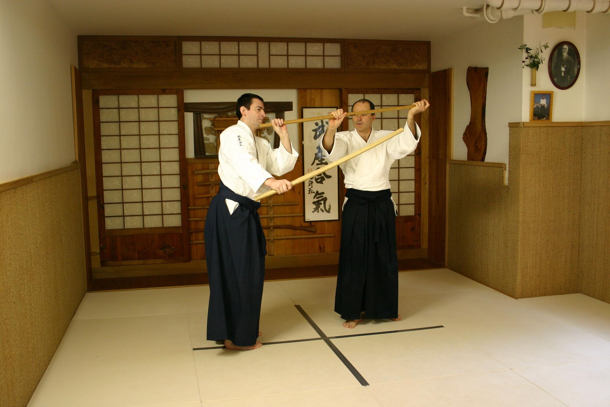 Uchi tachi : sortez de la ligne d'attaque vers la gauche, saisissez l'extrémité du jo par dessus avec votre main gauche, prêt à couper avec le sabre.