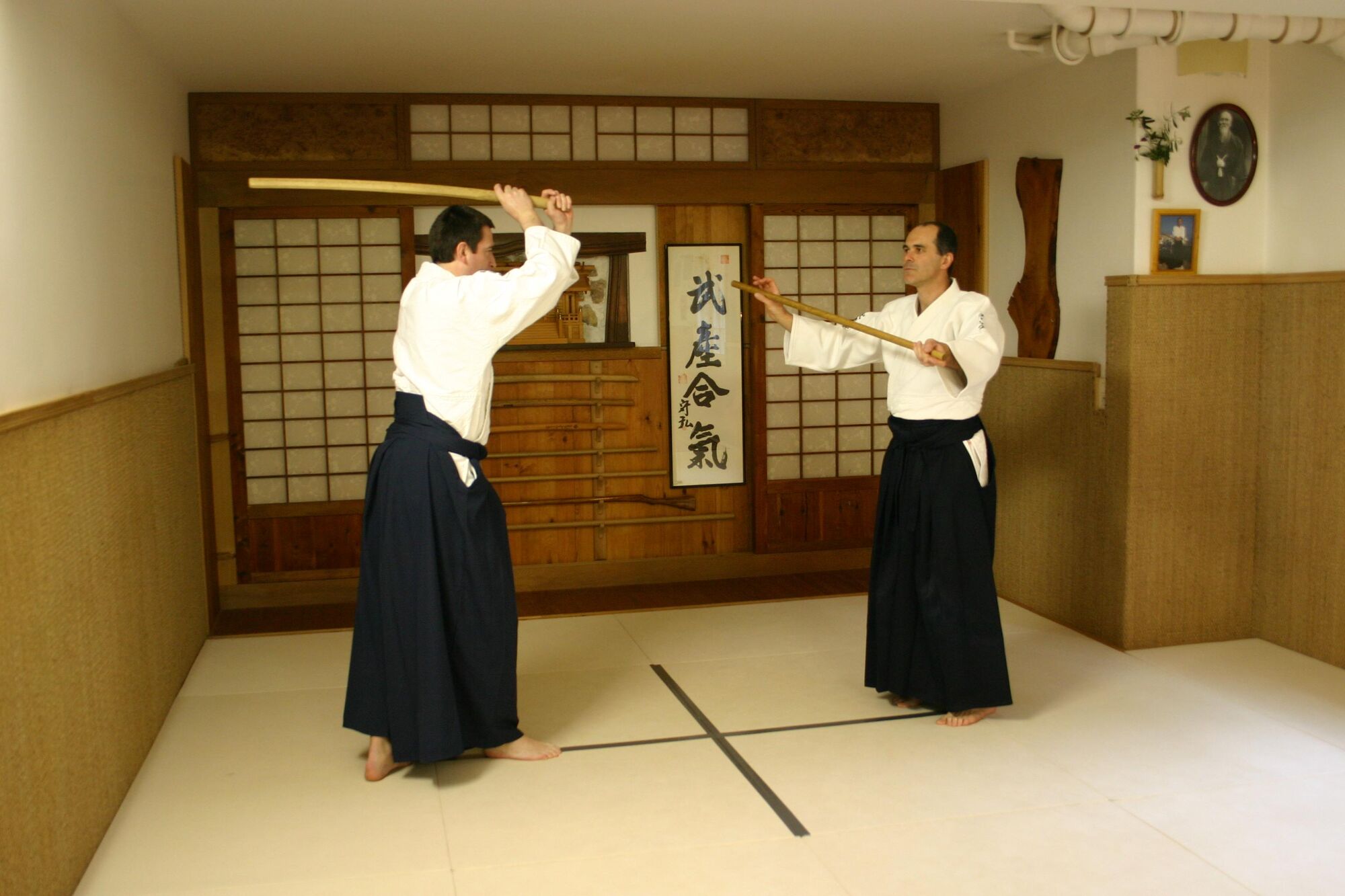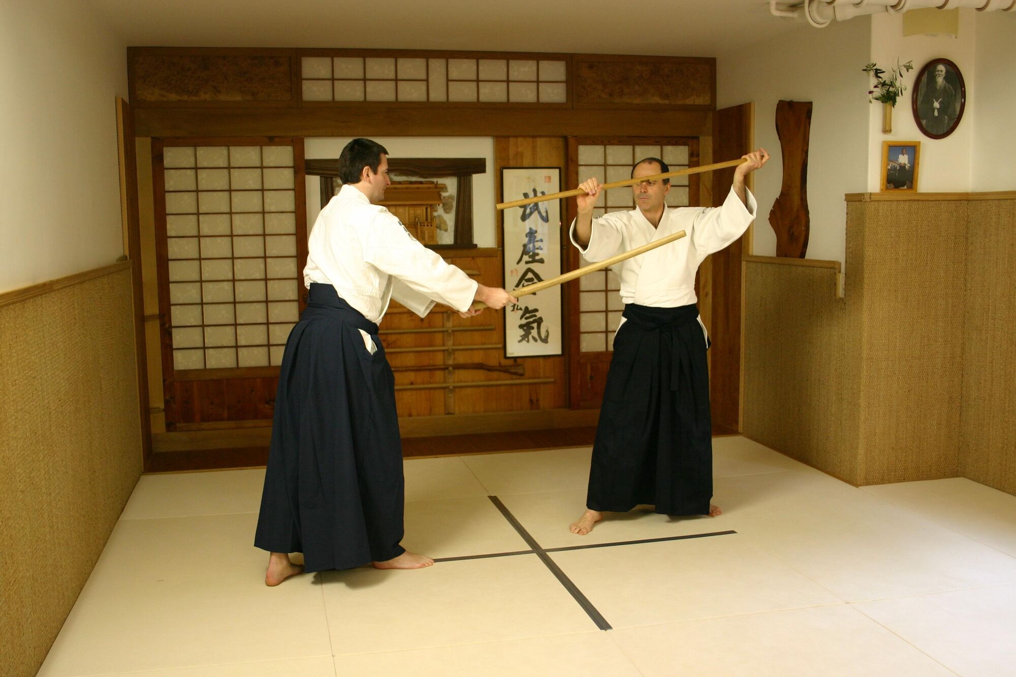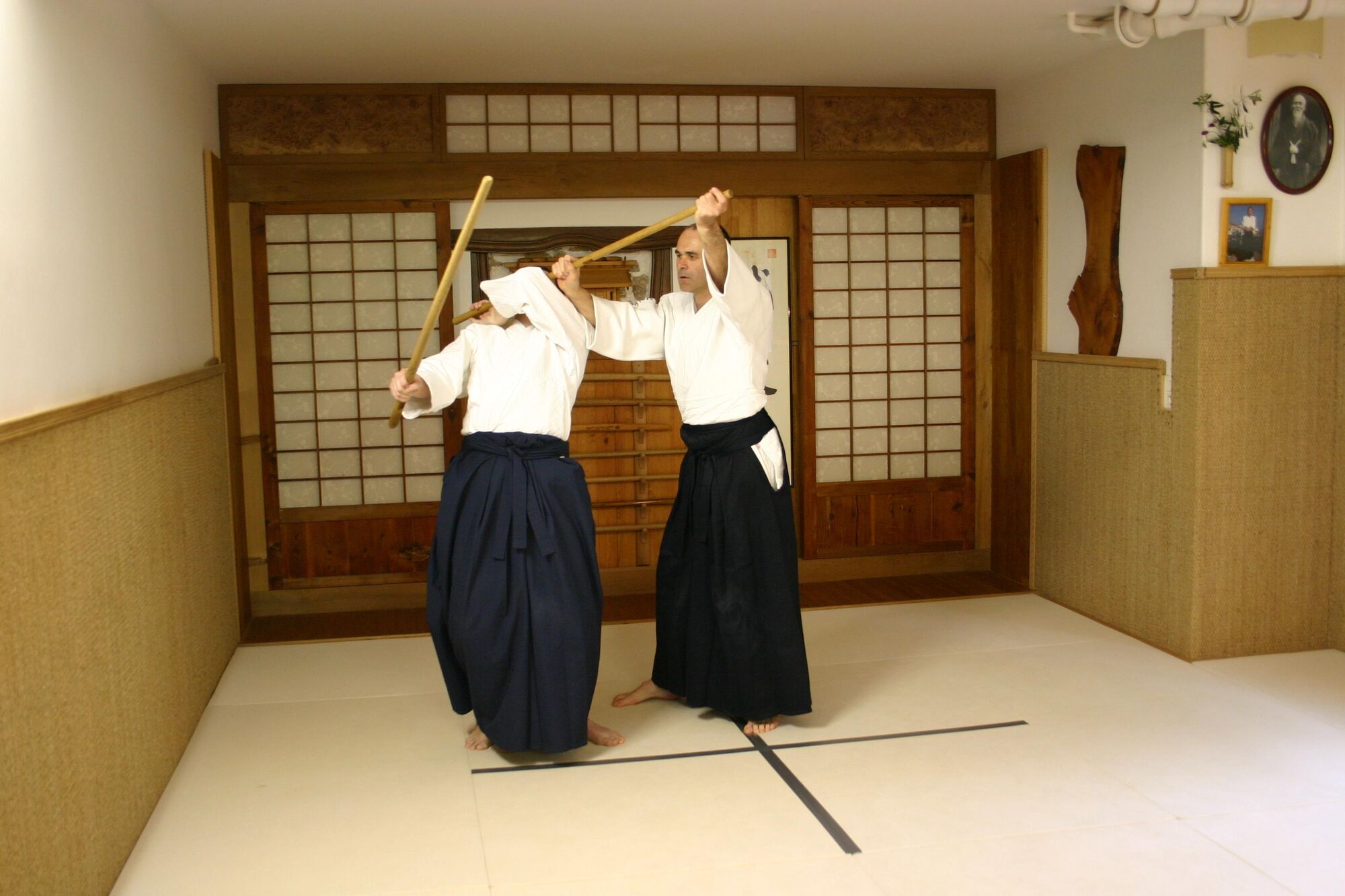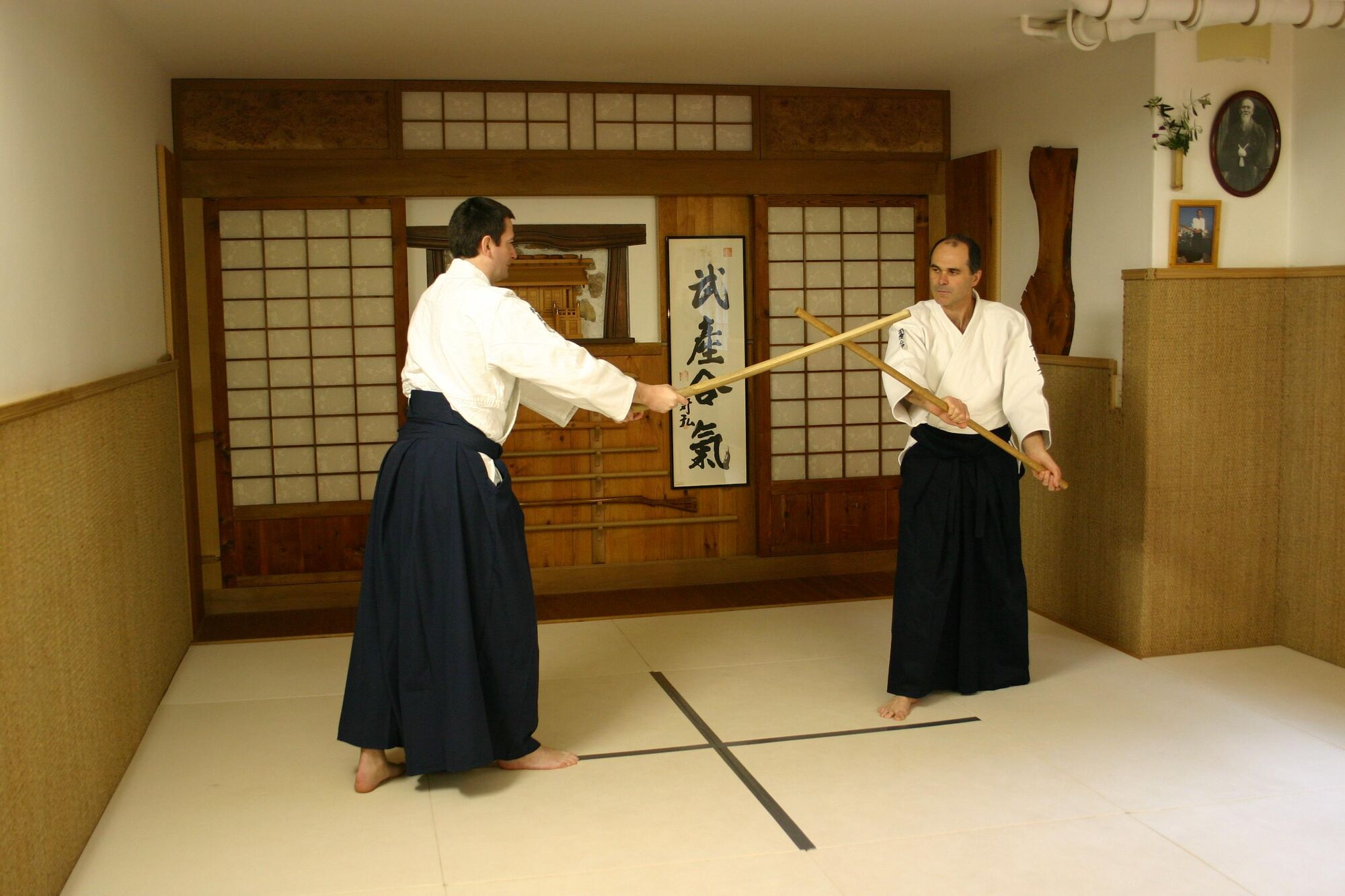 Uchi tachi : sortez de la ligne d'attaque vers la gauche, saisissez l'extrémité du jo par dessus avec votre main gauche, prêt à couper avec le sabre.