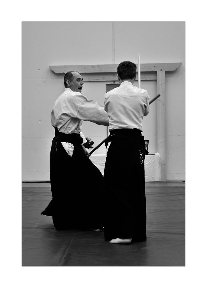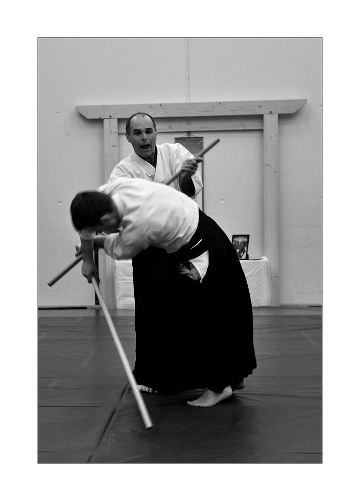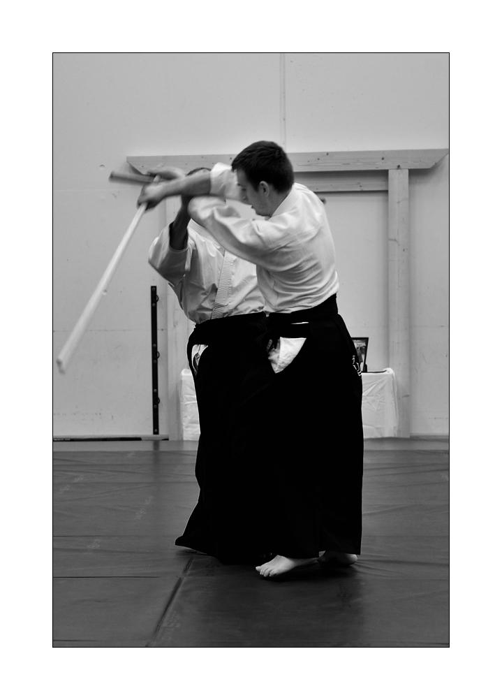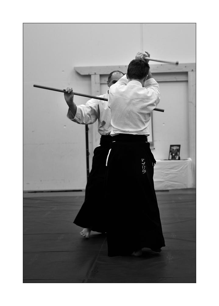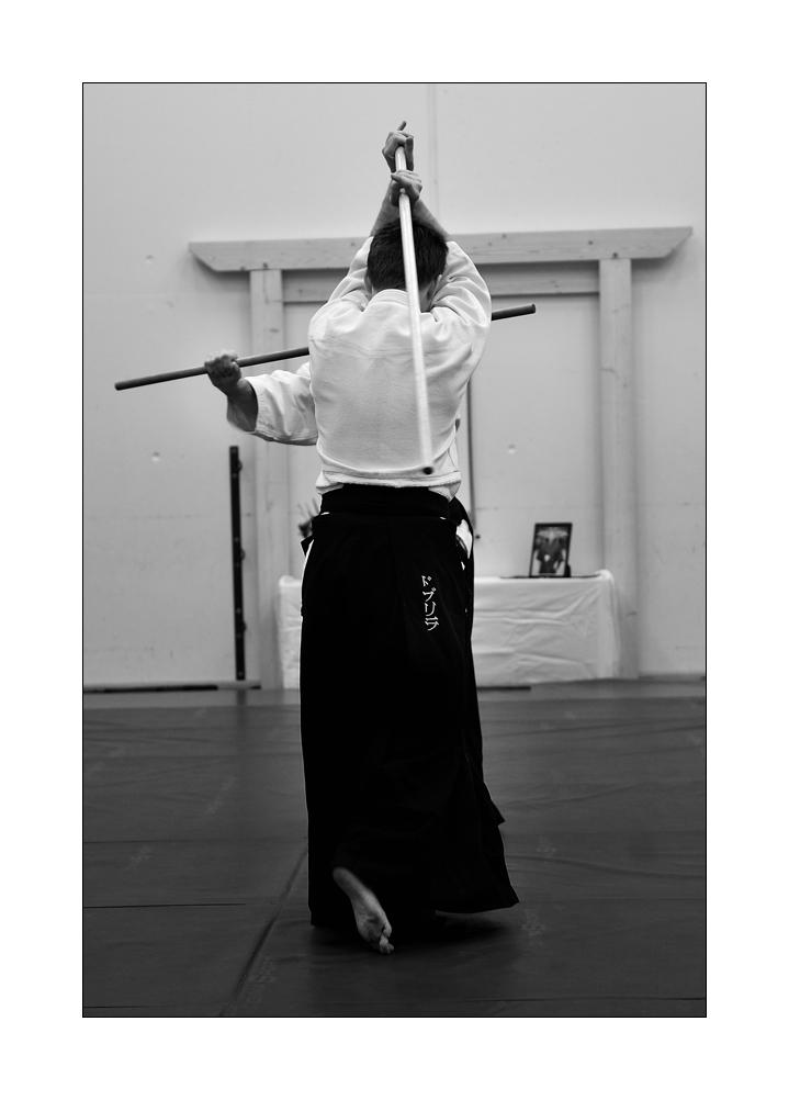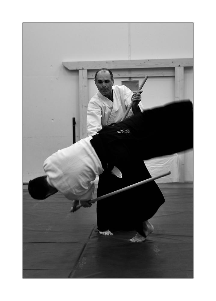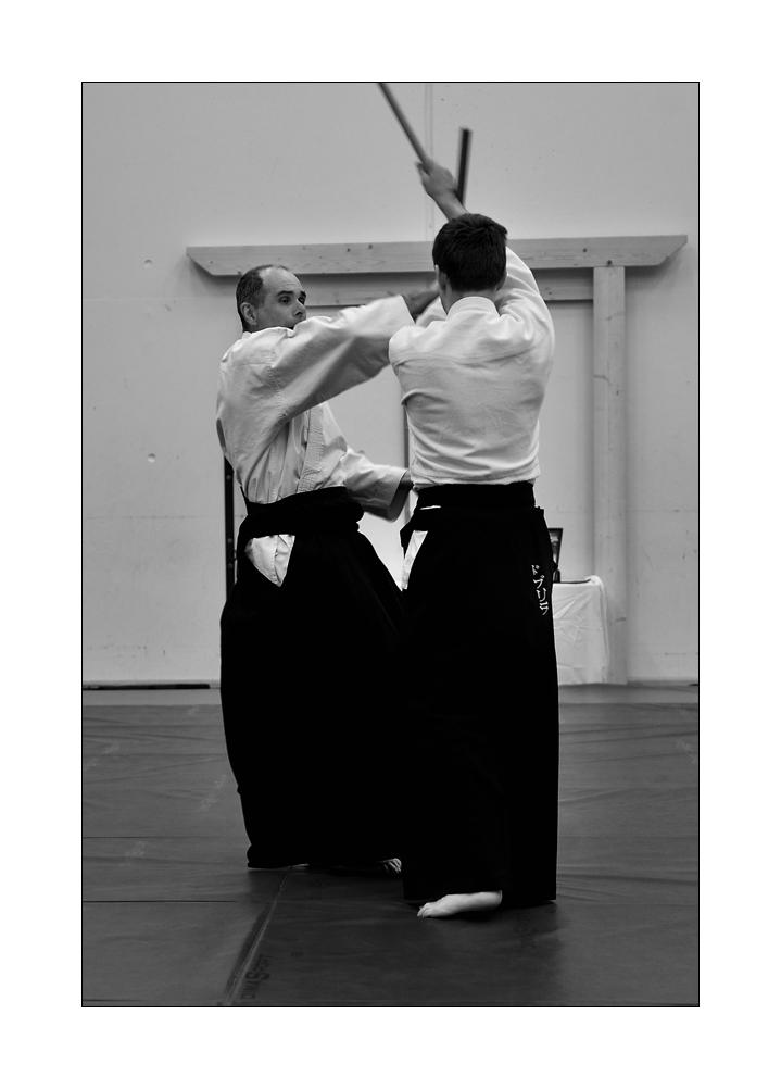 Les photos 4, 5 et 6 montrent comment l’extrémité arrière de l’arme d’uke jo glisse en yokomen entre les deux avant-bras d’uchi jo en suivant l’itinéraire de kessa giri.