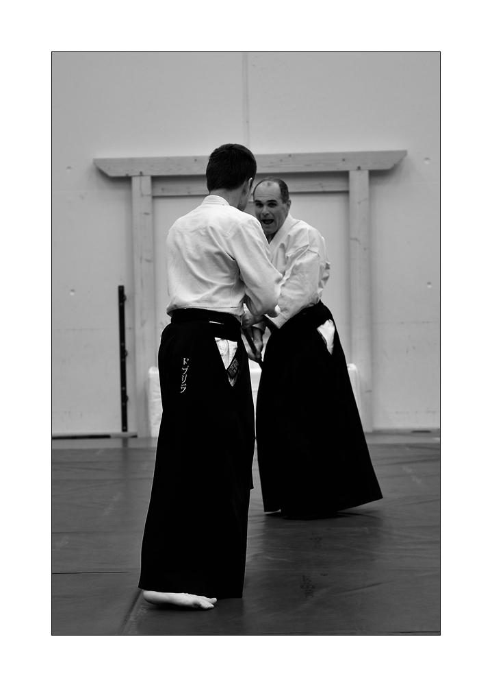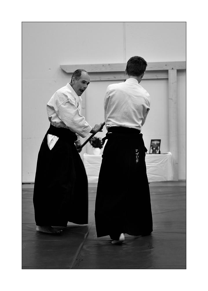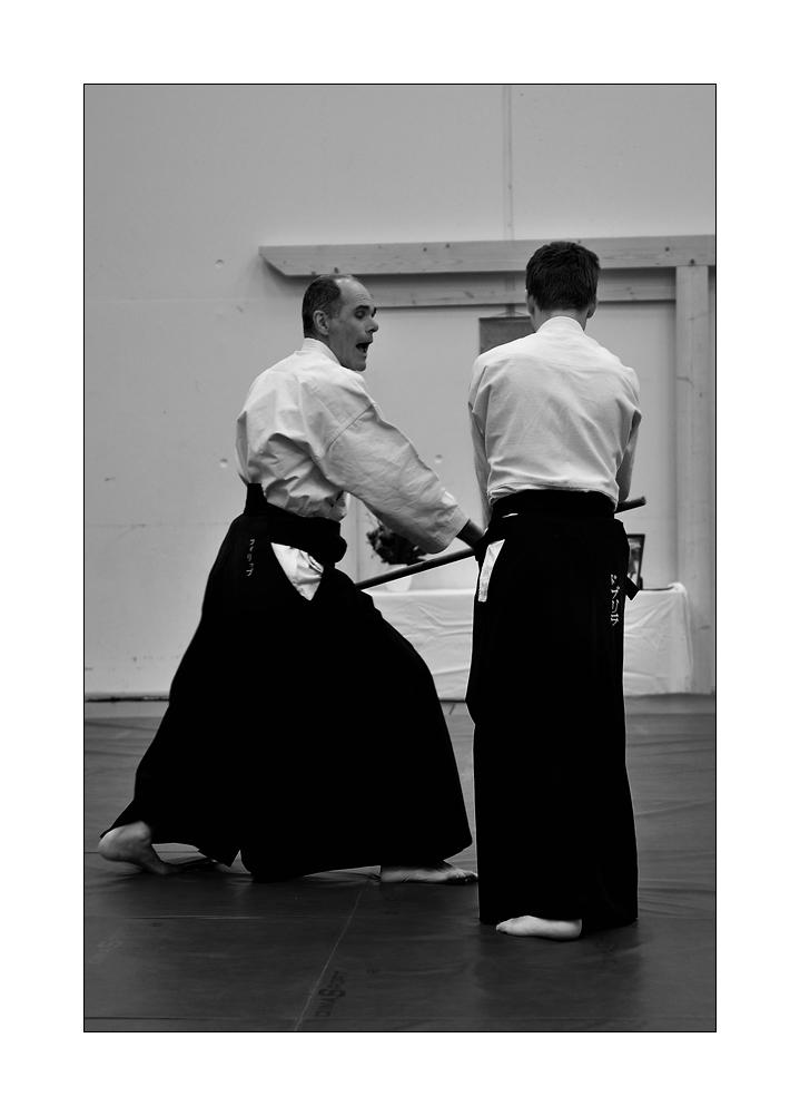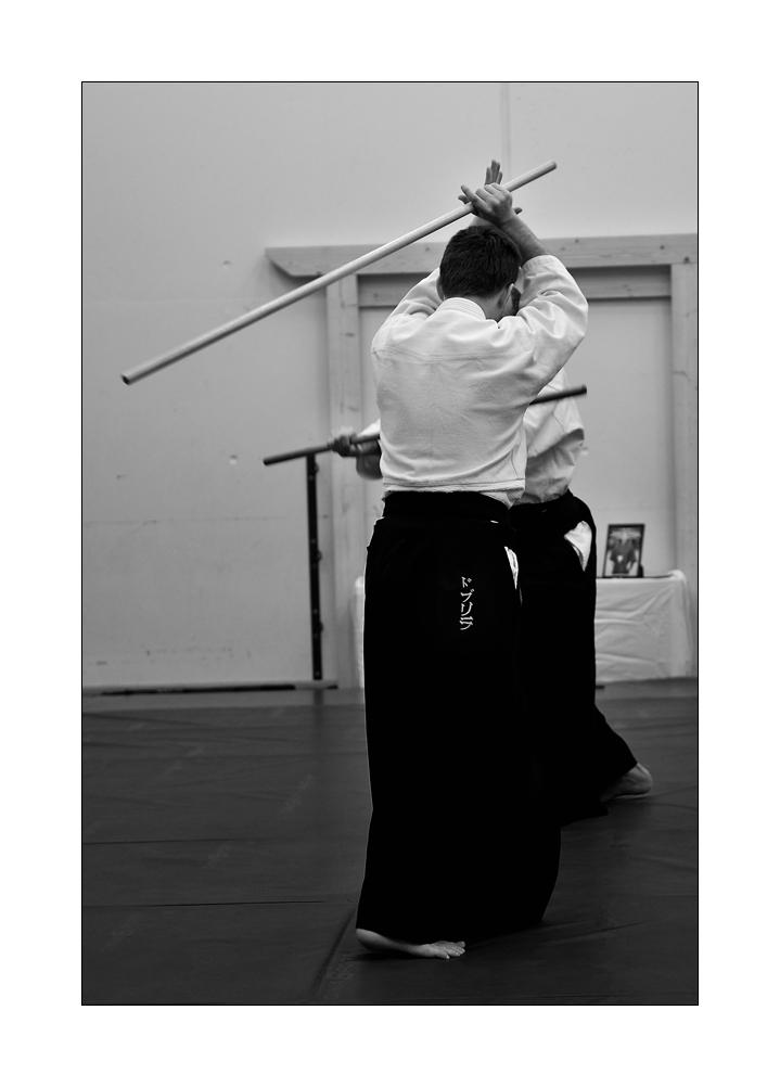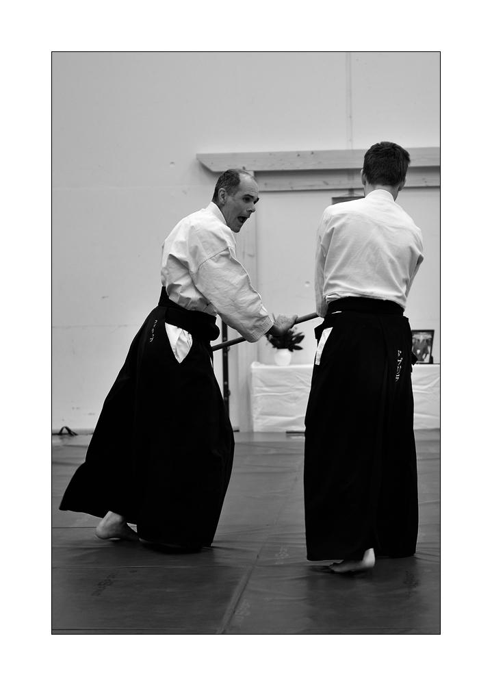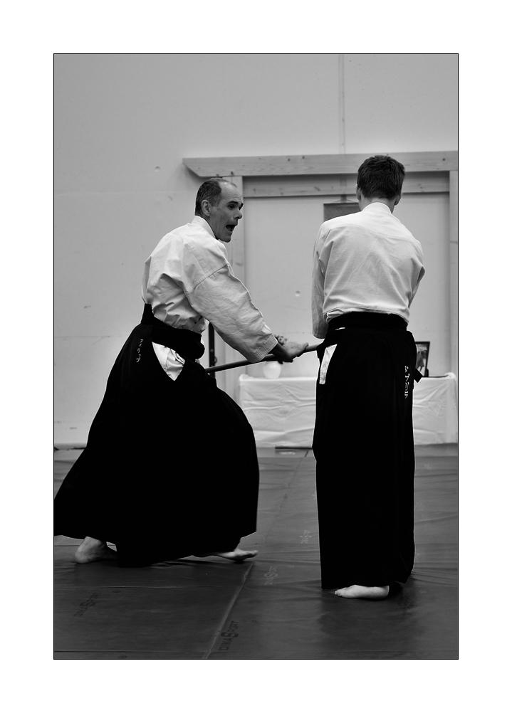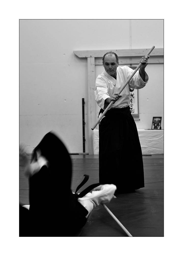 Les photos 4, 5 et 6 montrent comment l’extrémité arrière de l’arme d’uke jo glisse en yokomen entre les deux avant-bras d’uchi jo en suivant l’itinéraire de kessa giri.