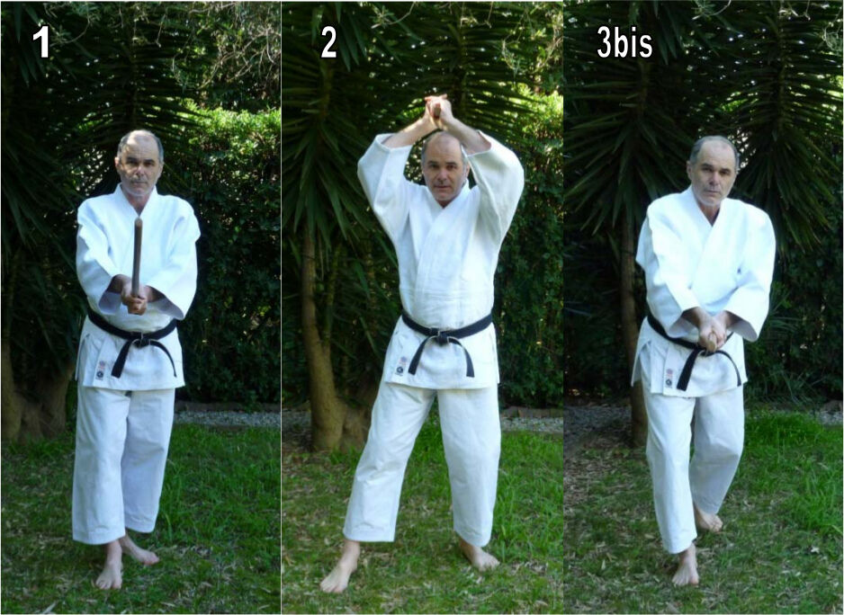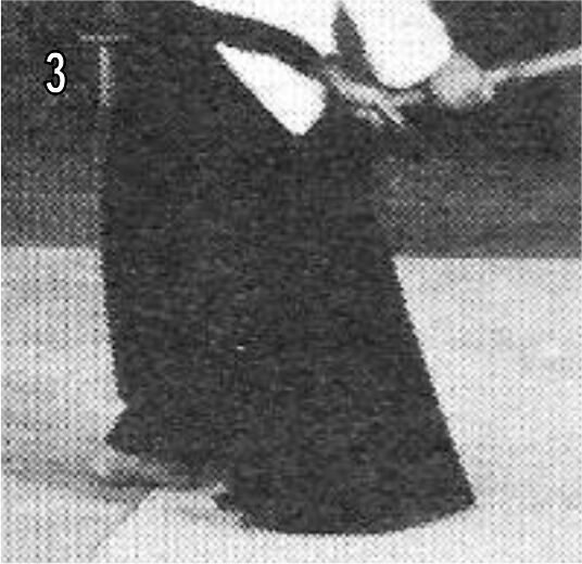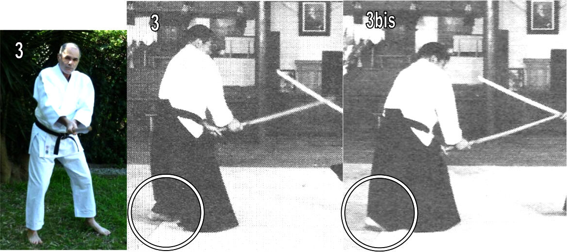 On constate ici de manière certaine qu’au moment où la coupe est quasiment terminée (3), le pied arrière de maître Saito n’a pas encore bougé, et qu’il se trouve encore dans la ligne d’attaque. Ce n’est que dans le temps suivant immédiatement la coupe (3bis), qu’il se déplace enfin pour que le corps retrouve la position de profil (hanmi).