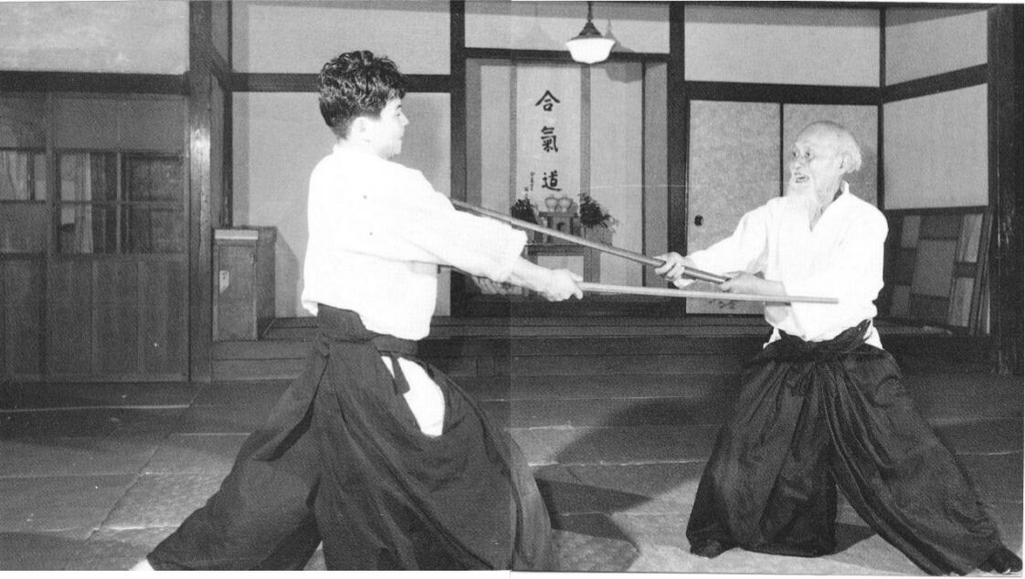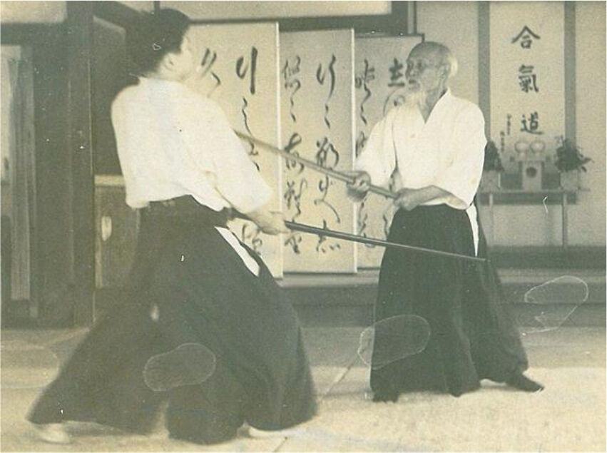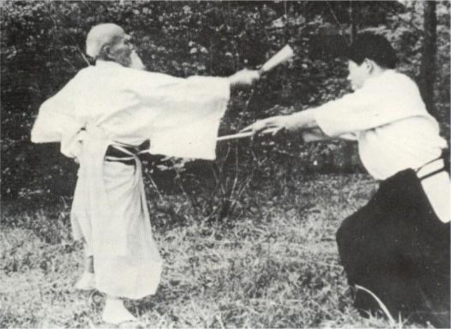 Sur la cinquième photo ci-dessous, prise à Iwama, la ligne d’attaque est matérialisée cette fois par le tsuki de Morihiro Saito. Mais on s’aperçoit qu’O Sensei se déplace exactement de la même manière que sur les photos précédentes : le corps et le pied avant s’écartent de la ligne, mais le pied arrière, lui, reste imperturbablement immobile à ce moment de l’action :