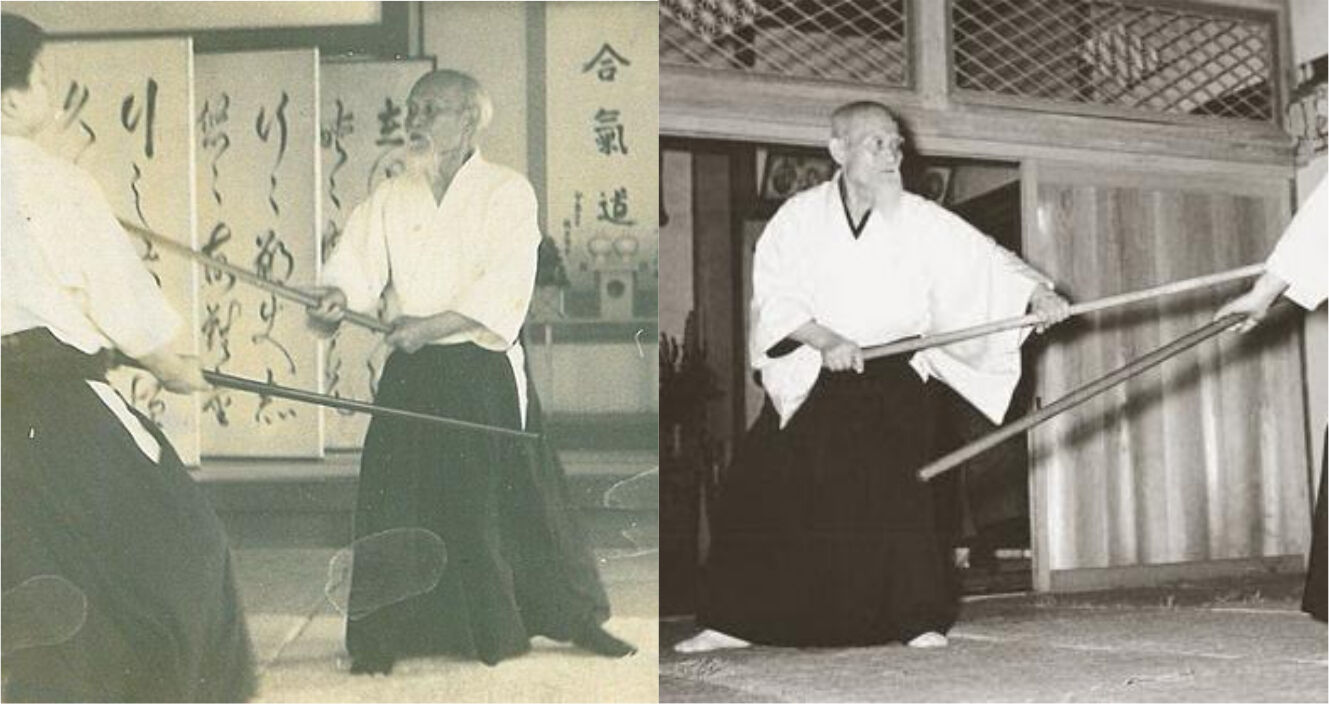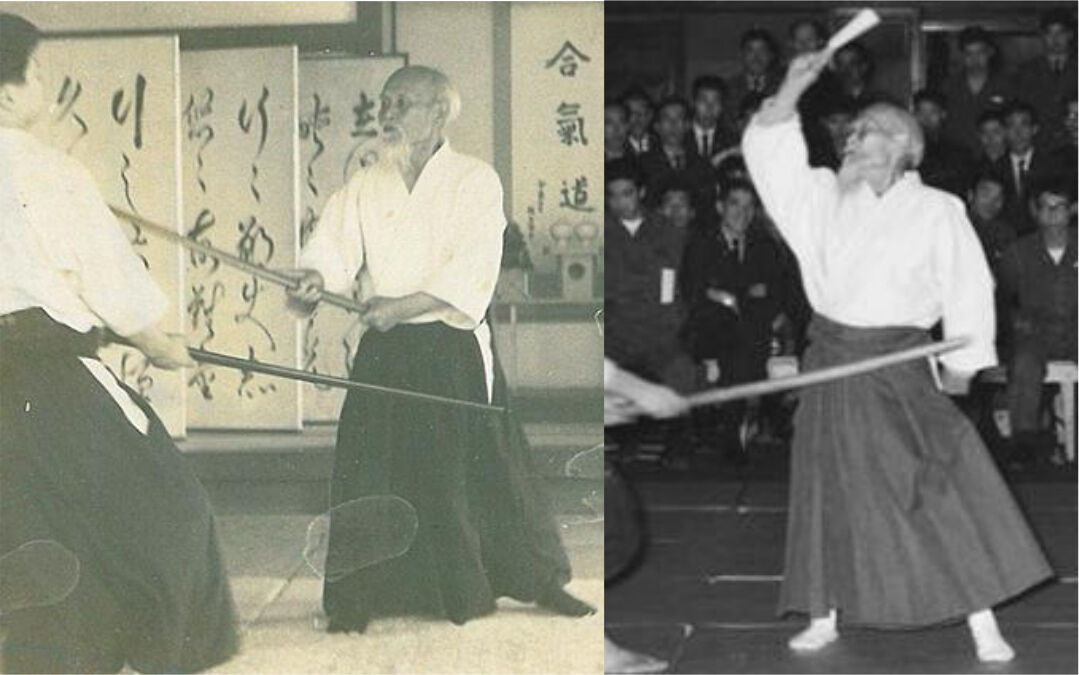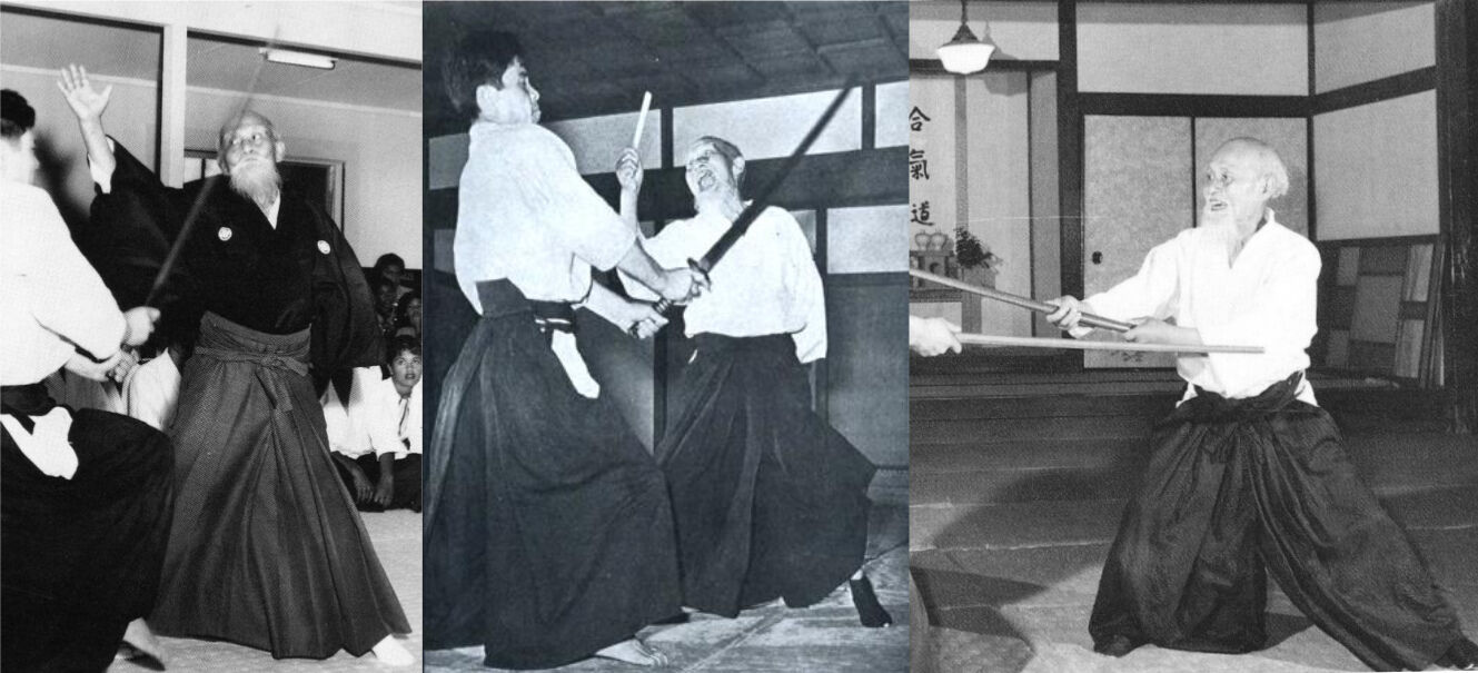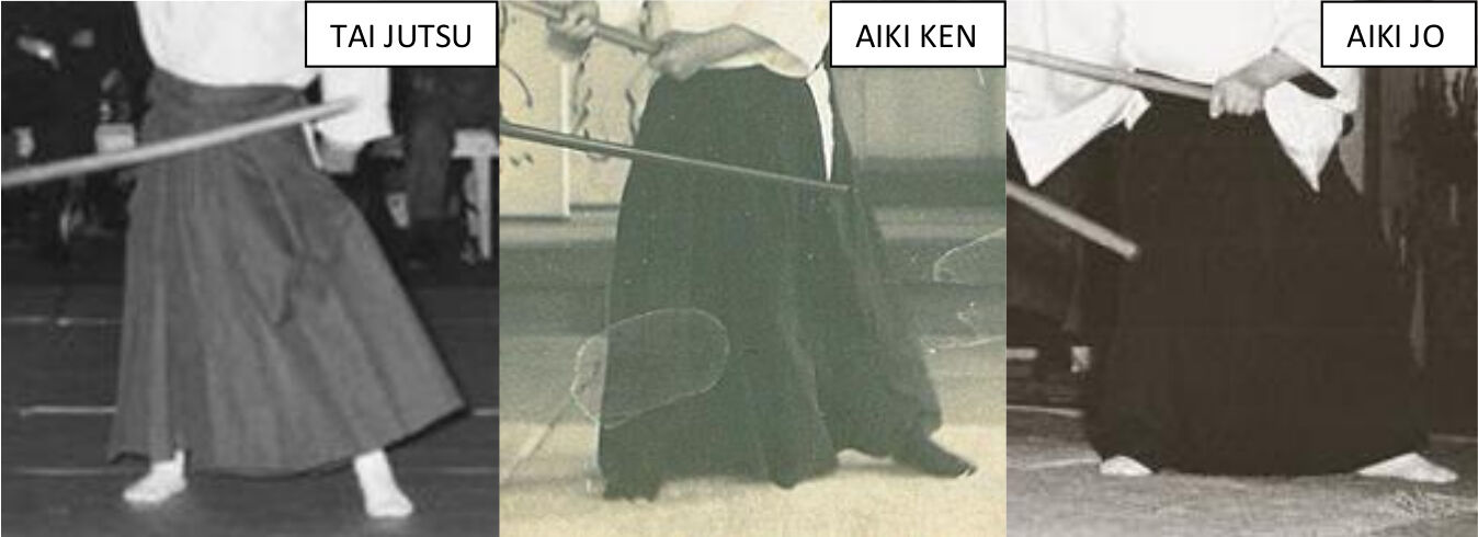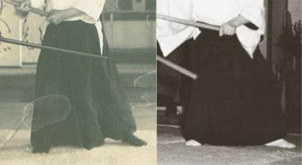 Cette différence est marquée par une position très particulière des pieds d’O Sensei : le pied arrière ne bouge absolument pas, il reste dans la ligne d’attaque du sabre, le corps quitte donc cette ligne d’attaque grâce au déplacement exclusif du pied avant qui est ici caché par le hakama :
