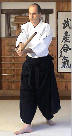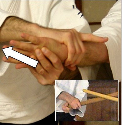 Le fait de croiser les mains en saisissant la base du pouce d'uke place votre bras qui est le plus près d'uke dans l'extension idéale pour continuer votre spirale. Tenez le bras d'uke comme vous tenez votre ken.