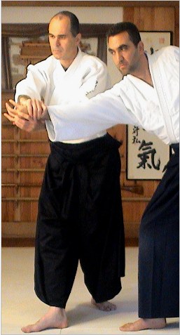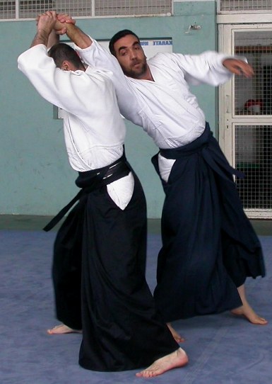 Quand la saisie est correcte, vous pouvez mettre le bras d'uke en extension, vous pouvez monter vos deux bras au-dessus de votre tête comme si vous coupiez avec le sabre, uke est déséquilibré et il ne peut pas vous gêner lors de la rotation.