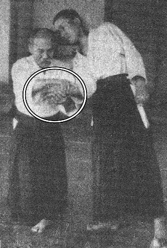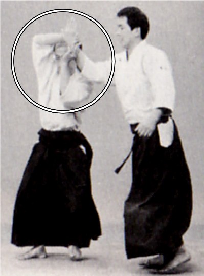 Quand la saisie est incorrecte et que les mains ne sont pas croisées, l'extension de votre bras qui est près d'uke est mauvaise. C'est la raison pour laquelle on peine à monter les bras au-dessus de la tête. Uke n'est pas déséquilibré, son bras est plié et il peut faire chuter tori vers l'arrière au moment de la rotation.