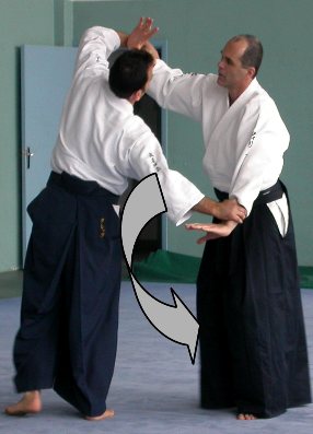 Attention, le mouvement du corps est double : la jambe avant entre tout droit en diagonale dans le dos d’uke, mais en même temps l’axe du corps et donc tout le buste travaillent en rotation. Cette rotation a pour effet de projeter uke vers l’intérieur de votre corps, et pas tout droit devant vous. Pendant la projection aussi vos bras doivent être en arc de cercle.