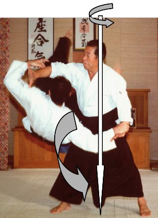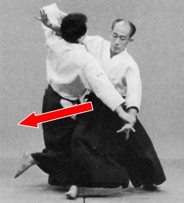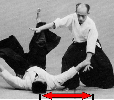 Si tori entre correctement sa jambe arrière en diagonale mais qu’il pousse uke droit devant, comme sur les photos ci-dessus, il n’y a aucune rotation de l’axe du corps, les bras de tori ne respectent pas la position en arc de cercle de kokyu ryoku, uke chute loin devant tori, hors de son contrôle, et il ne peut l’amener au sol avec puissance et contrôler comme c’est possible avec la rotation de l’axe du corps.