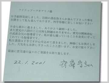 Maître SAITO m'a décerné le sixième dan « Iwama ryu » au mois de janvier 2001. Dans sa lettre datée du 22 janvier accompagnant le diplôme il écrit :