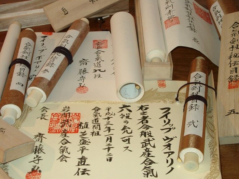 J'ai obtenu de la main de Morihiro SAITO les cinq Mokuroku d'Aiki-ken et d'Aiki-jo entre 1989 et 1991. Nous ne sommes pas une dizaine dans le monde à les posséder.