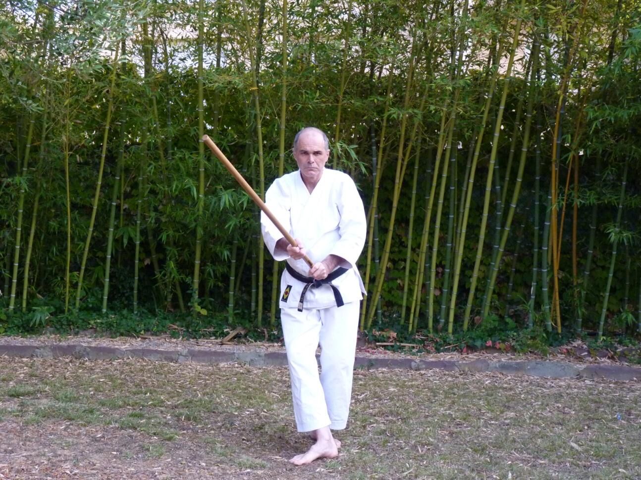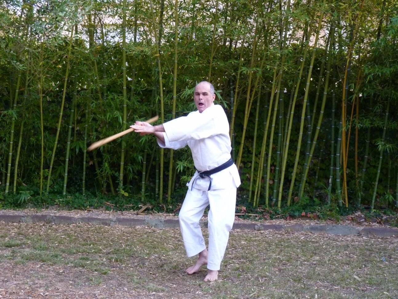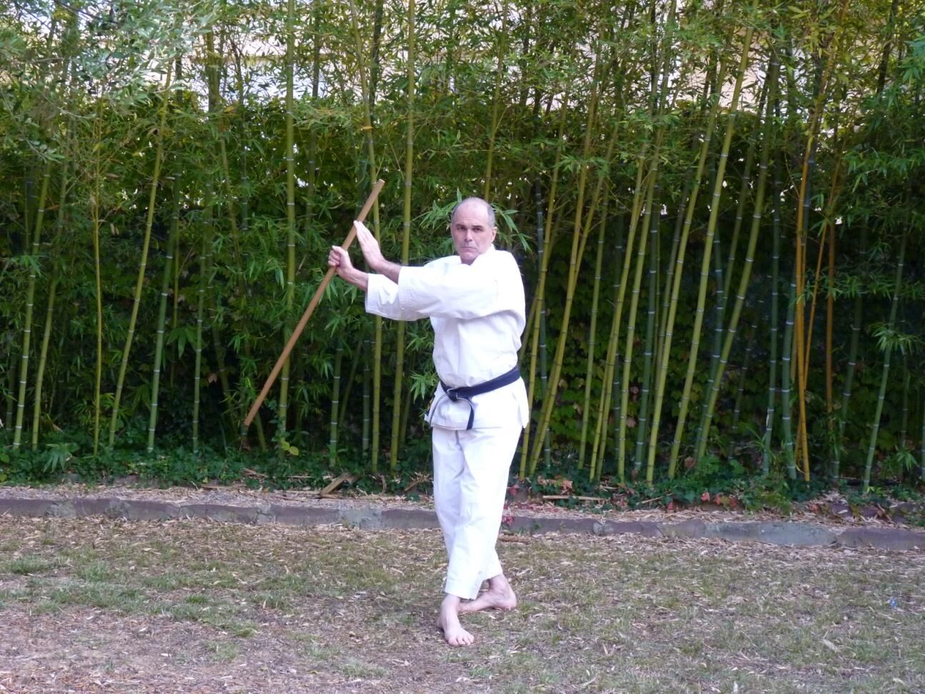 En terminant votre rotation vers l’arrière votre main gauche glisse à son tour vers le milieu du jo libérant ainsi l’emplacement de l’impact. La frappe ici est latérale.