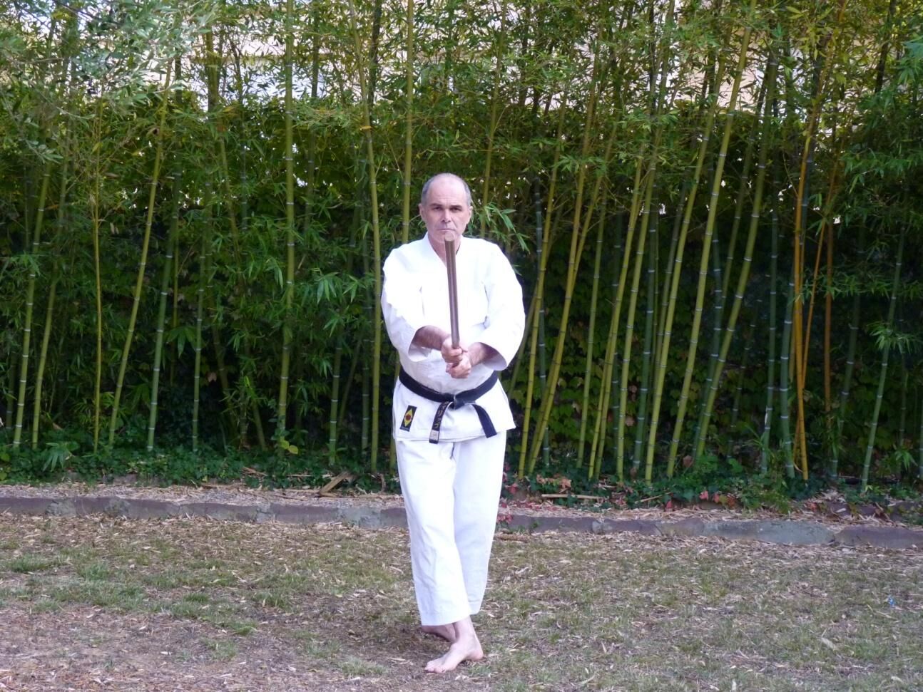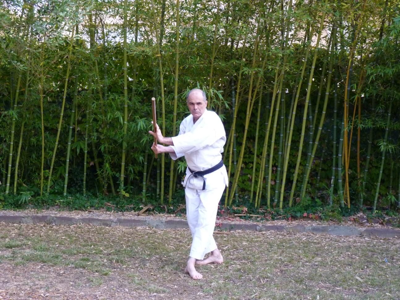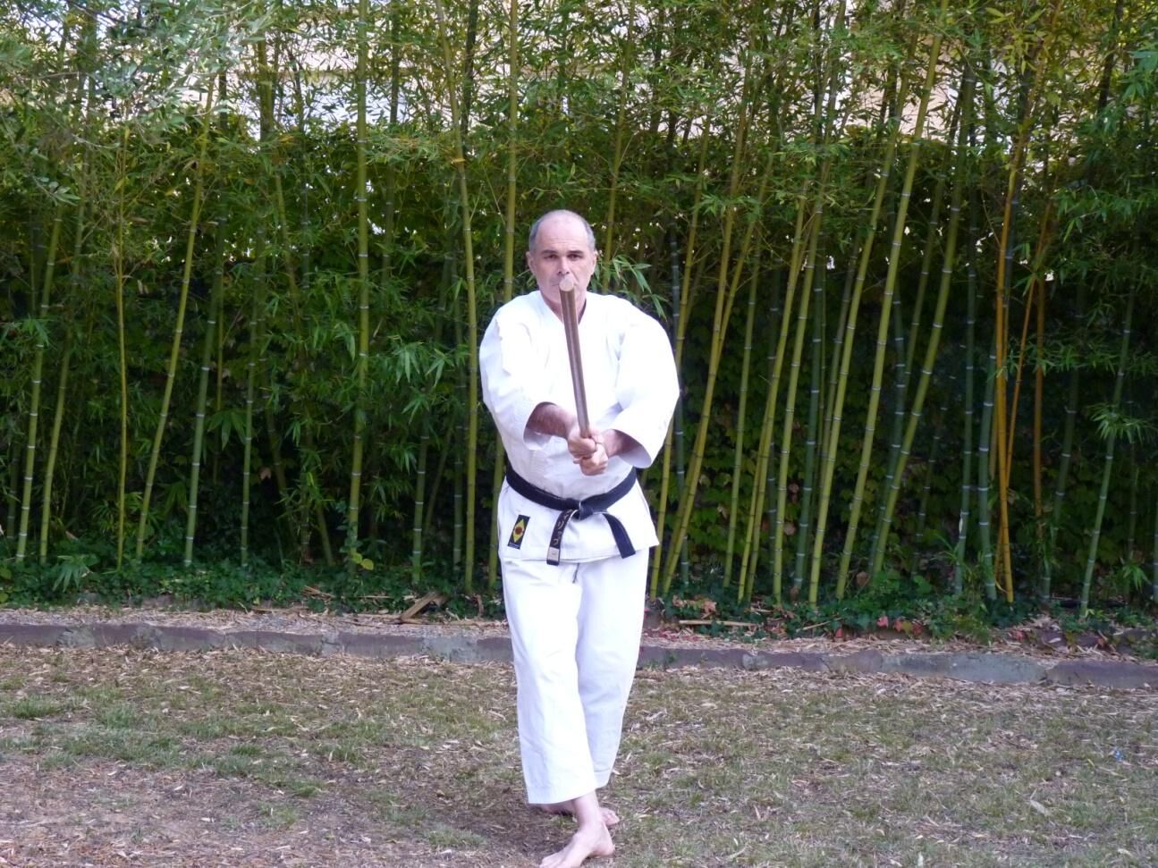En terminant votre rotation vers l’arrière votre main gauche glisse à son tour vers le milieu du jo libérant ainsi l’emplacement de l’impact. La frappe ici est latérale.