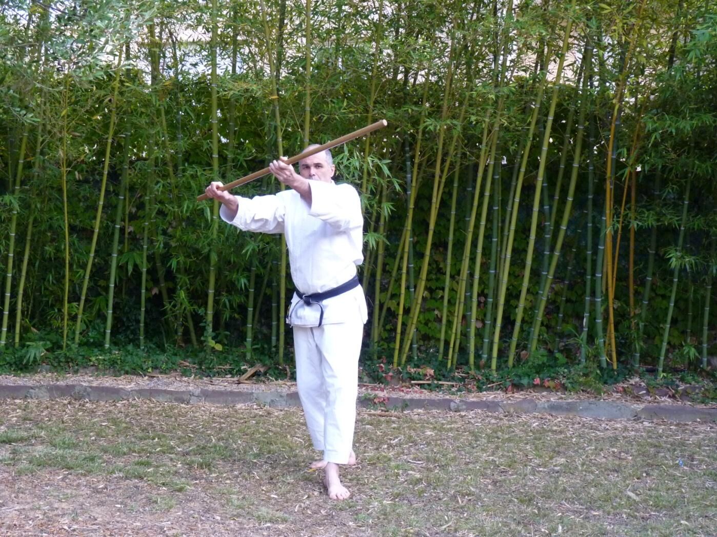 Continuez votre rotation, ce qui vous oblige à lâcher le jo de la main gauche pour le récupérer comme démontré sur la photo. Continuez votre frappe avec yokomen uchi. Quand le jo pivote de la sorte il décrit une spirale de la gauche vers la droite dans un plan incliné, qui rend obligatoire la frappe yokomen et impossible une frappe shomen (shomen uchi est une spirale dans le plan vertical qui n’est donc possible qu’en ligne, de l’arrière vers l’avant).