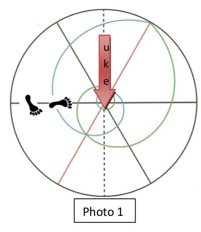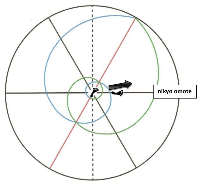 On voit très clairement sur les photos d’O Sensei et sur les schémas de pieds, que l’angle de nikyo ura est rigoureusement symétrique à l’angle de nikyo omote : l’un et l’autre sont opposés à 180°.