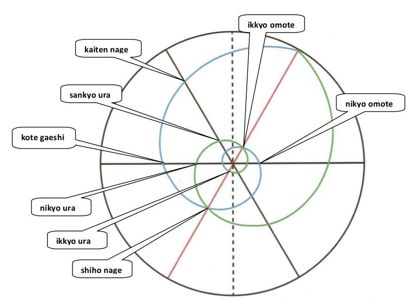 Nous avons vu dans kajo #10 comment ikkyo omote et ikkyo ura sont opposés à 180° l’un de l’autre, de part et d’autre d’une même ligne dont le centre est occupé par tori.
