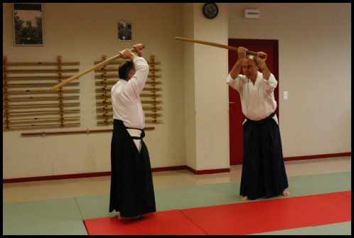 Uchi tachi : descendre le ken vers pied arrière (waki kamae).