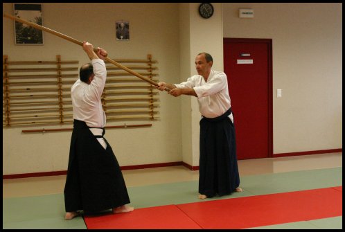 Uke tachi : piquer gorge (jodan tsuki) pied droit devant (irimi).
