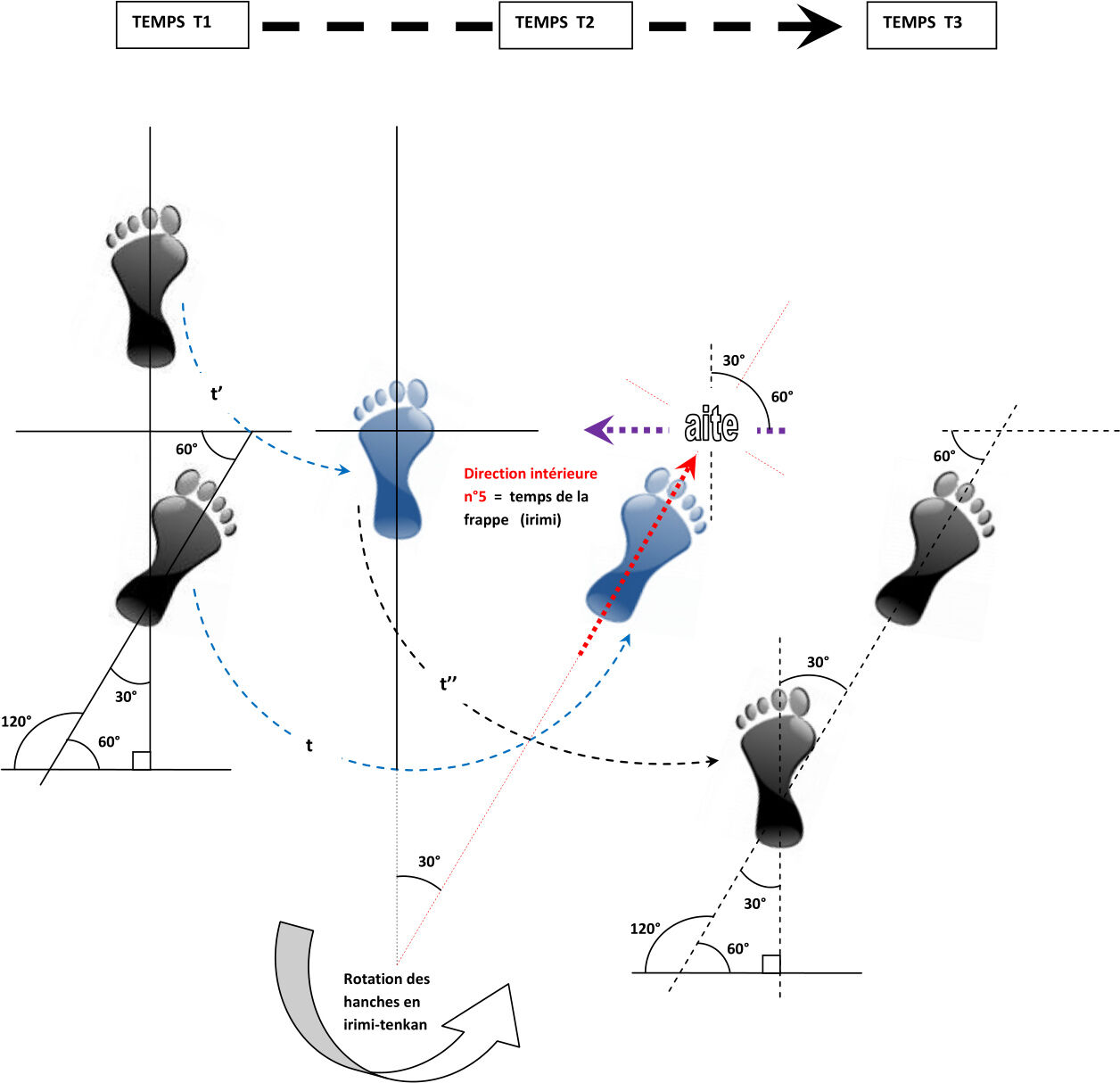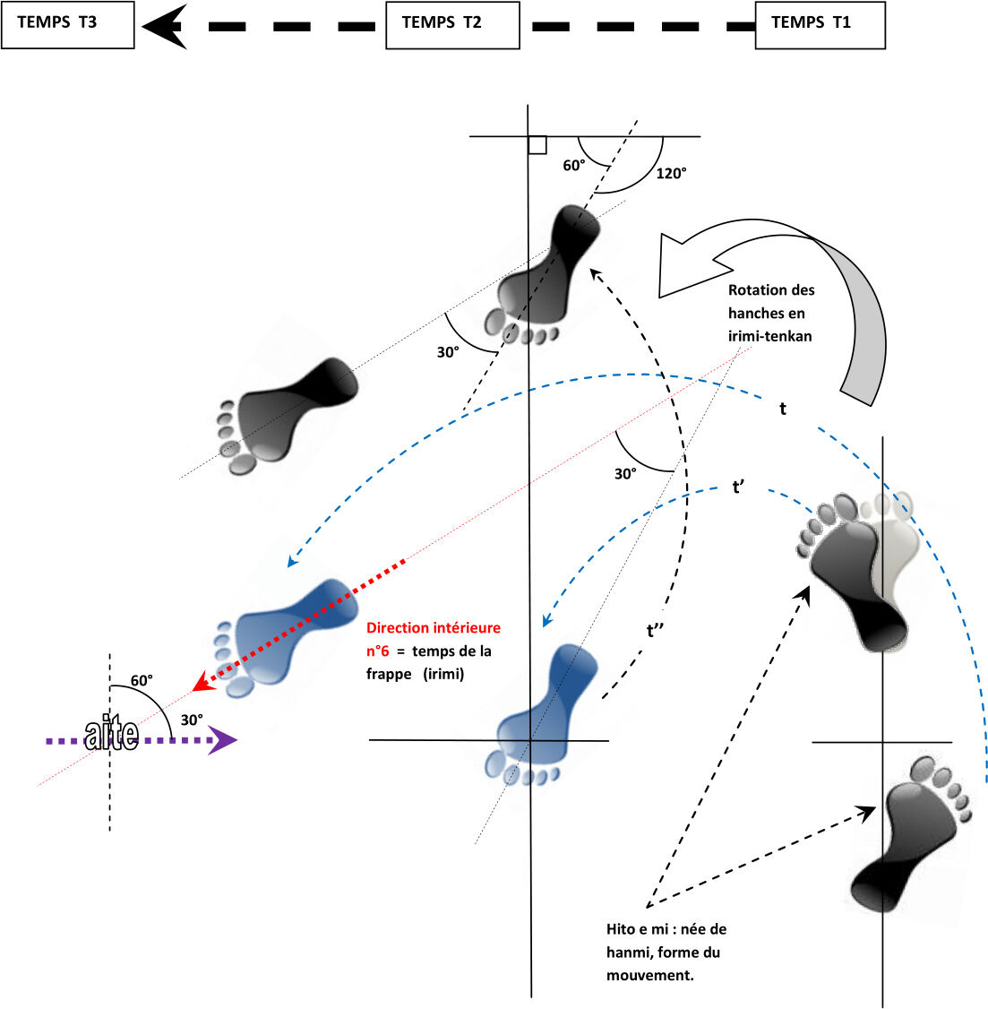 Autour de la position hanmi, il y a donc 3 directions intérieures prises à partir du pied avant, et 3 directions intérieures prises à partir du pied arrière.