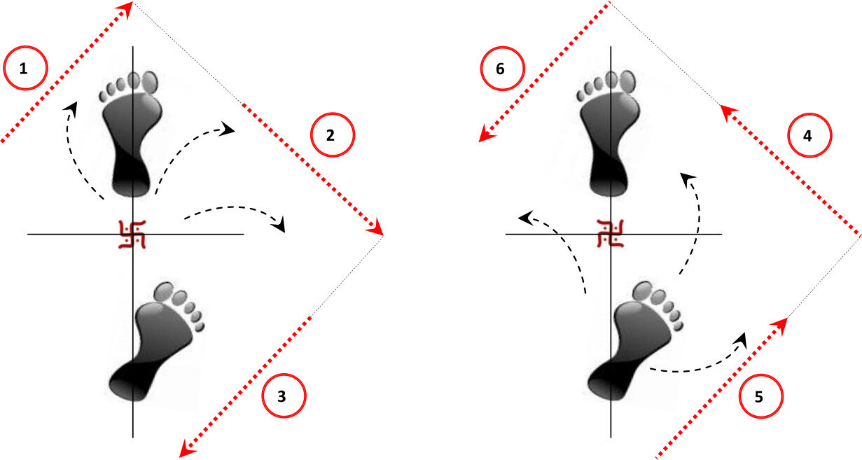 Cette direction intérieure n°6, qui est initiée par le pied arrière, est parfaitement symétrique à la direction intérieure n° 3 (cf. Déplacement d’O Sensei #2), qui est initiée, elle, par le pied avant. L’axe de symétrie passe par le centre de la croix au sol.