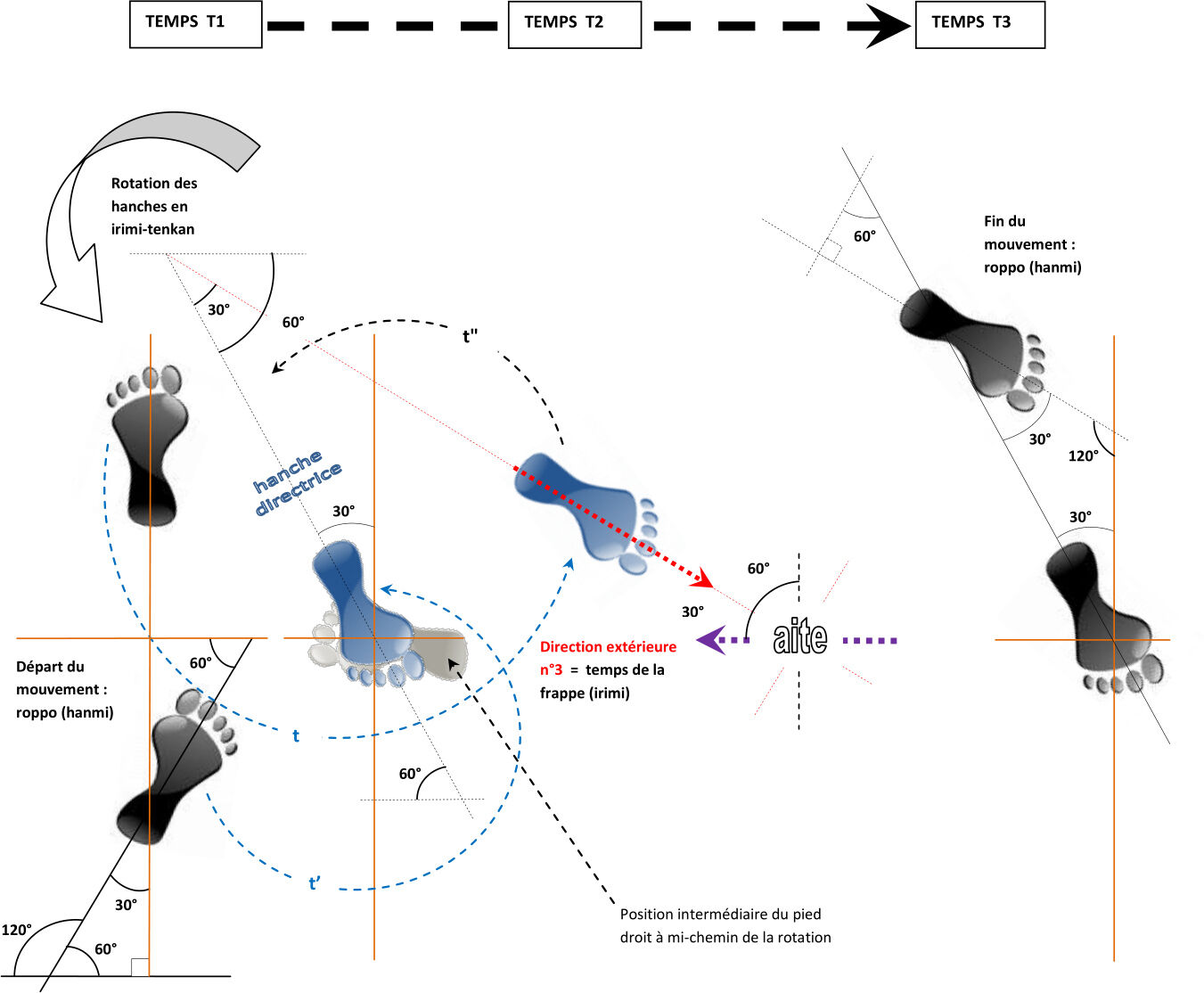 On peut vérifier la position hanmi de départ (roppo), l’angle des pieds à 30° au moment de l’irimi, le sens de rotation avec la hanche gauche pour hanche directrice, ainsi que la sortie de la ligne d’attaque.