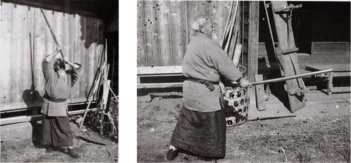 Magistrale parce que ces photos ont une histoire : elles ont été prises à Iwama dans les années 1950, O Sensei travaillait la terre avec quelques uchi deshi, dont Morihiro Saito,quand une vive discussion s’engagea au sujet de hanmi précisément. O Sensei sentit l’importance de ce moment, il fit chercher un photographe au village et il posa pour lui devant le dojo, dans ses habits de travail, pour fixer une fois pour toutes sur la pellicule et dans l’esprit de chacun, la position hanmi. Ces clichés ont donc valeur de référence pour décider ce qu’est ou ce que n’est pas la position hanmi, et dans le contexte où ils furent pris ils devraient normalement faire autorité.