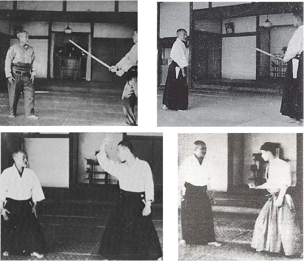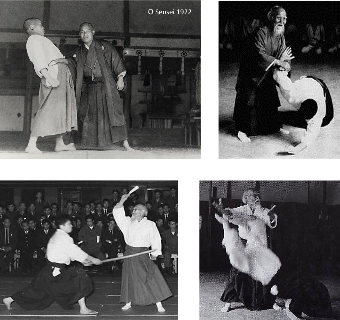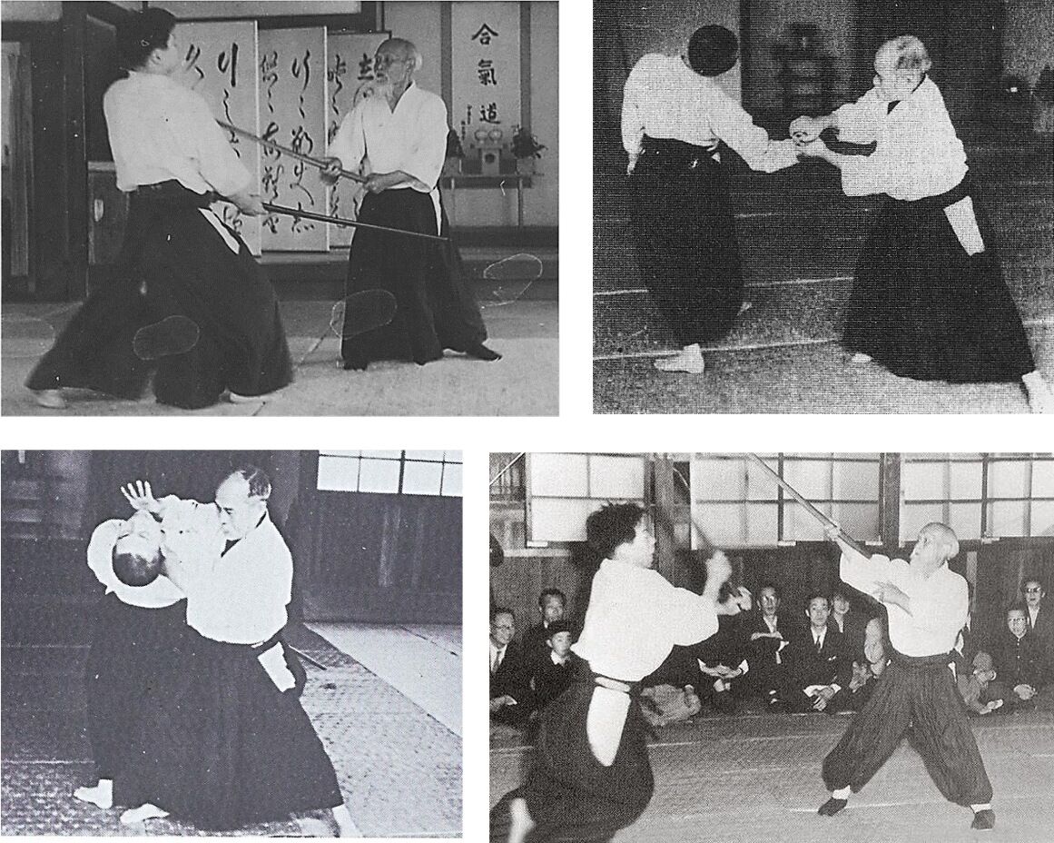 Mais s’il faut d’autres preuves, les photos suivantes, prises à différents âges de la vie du Fondateur confirment que ce dernier adopte invariablement la même position de garde hanmi, avec ou sans arme. Il n’existe pas de photo ou de vidéo montrant O Sensei attendre une attaque à l’arrêt dans une autre position que celle-ci: