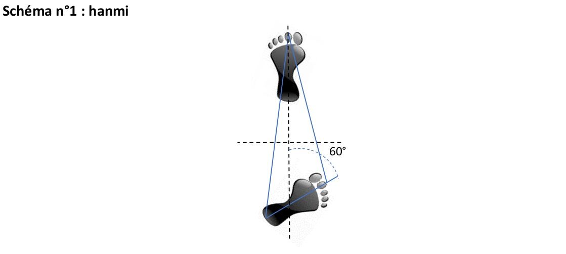 Il n’y a donc qu’une position hanmi, elle peut évidemment se prendre à gauche ou à droite. Toutefois il existe, outre cette position, des placements de pieds transitoires nécessaires entre une position hanmi initiale et la position hanmi qui lui succède quand l’action est terminée. Ces transitions sont au nombre de deux.
