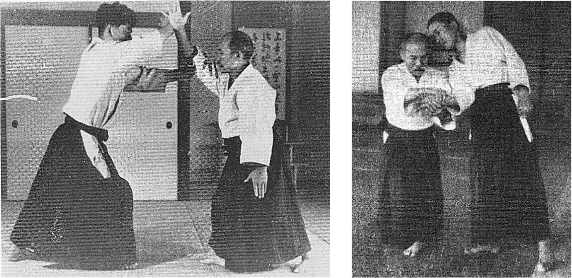 En kenka goshi, les deux hanches sont en opposition (c’est d’ailleurs la traduction de cette expression japonaise), et cette opposition des hanches verrouille le mouvement pendant la fraction de seconde nécessaire à l’explosion de la puissance, juste avant de revenir à la position hanmi, en voici quelques exemples chez O Sensei à des âges variés de sa vie :