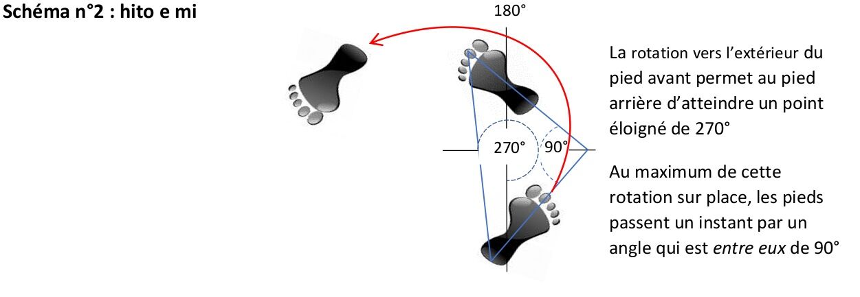 La première transition porte le nom de hito e mi, il s’agit d’une ouverture rotative caractéristique du pied avant qui permet le passage du pied arrière vers l’avant. Cette transition est indispensable dans certains mouvements comme ikkyo, shiho nage ou kaiten nage par exemple, parce que le pied arrière doit y atteindre un point éloigné de 270° de sa position initiale, mais elle n’est pas nécessaire pour un point éloigné de moins de 180° :