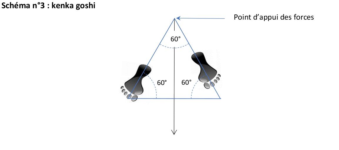 La seconde transition porte le nom de kenka goshi. Elle s’exprime sous la forme d’un triangle équilatéral qui se met en place au déclenchement de l’attaque, quand les pieds quittent hanmi. Ce triangle équilatéral offre la stabilité maximum que le corps humain puisse obtenir, et dont il a absolument besoin pour frapper ou pour projeter. Cette stabilité est acquise par l’inversion du sommet du triangle équilatéral qui est dirigée vers l’arrière de tori (le sommet du triangle aigu formé par hanmi est dirigé vers l’avant parce que dans cette position c’est la mobilité qui est recherchée plus que la stabilité).
