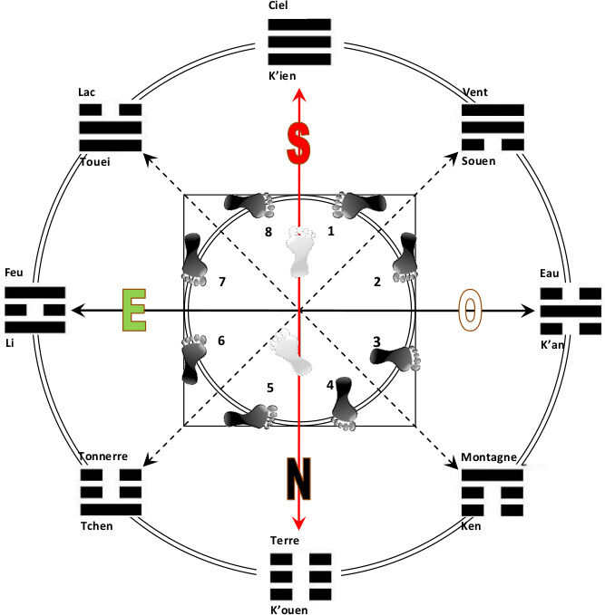 Le déplacement physique du pratiquant d’Aikido est donc en rapport avec les modalités de la manifestation du Ciel et de la Terre telles que les enseigne la tradition chinoise :