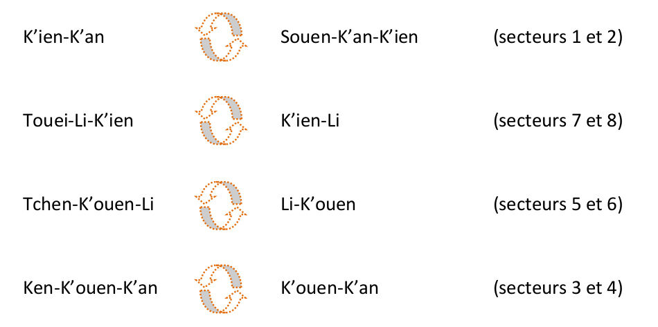Ces huit irimi sont en rapport avec les huit trigrammes fondamentaux de Fuxi (qui sont eux-mêmes à l’origine des 64 hexagrammes du Yi King).