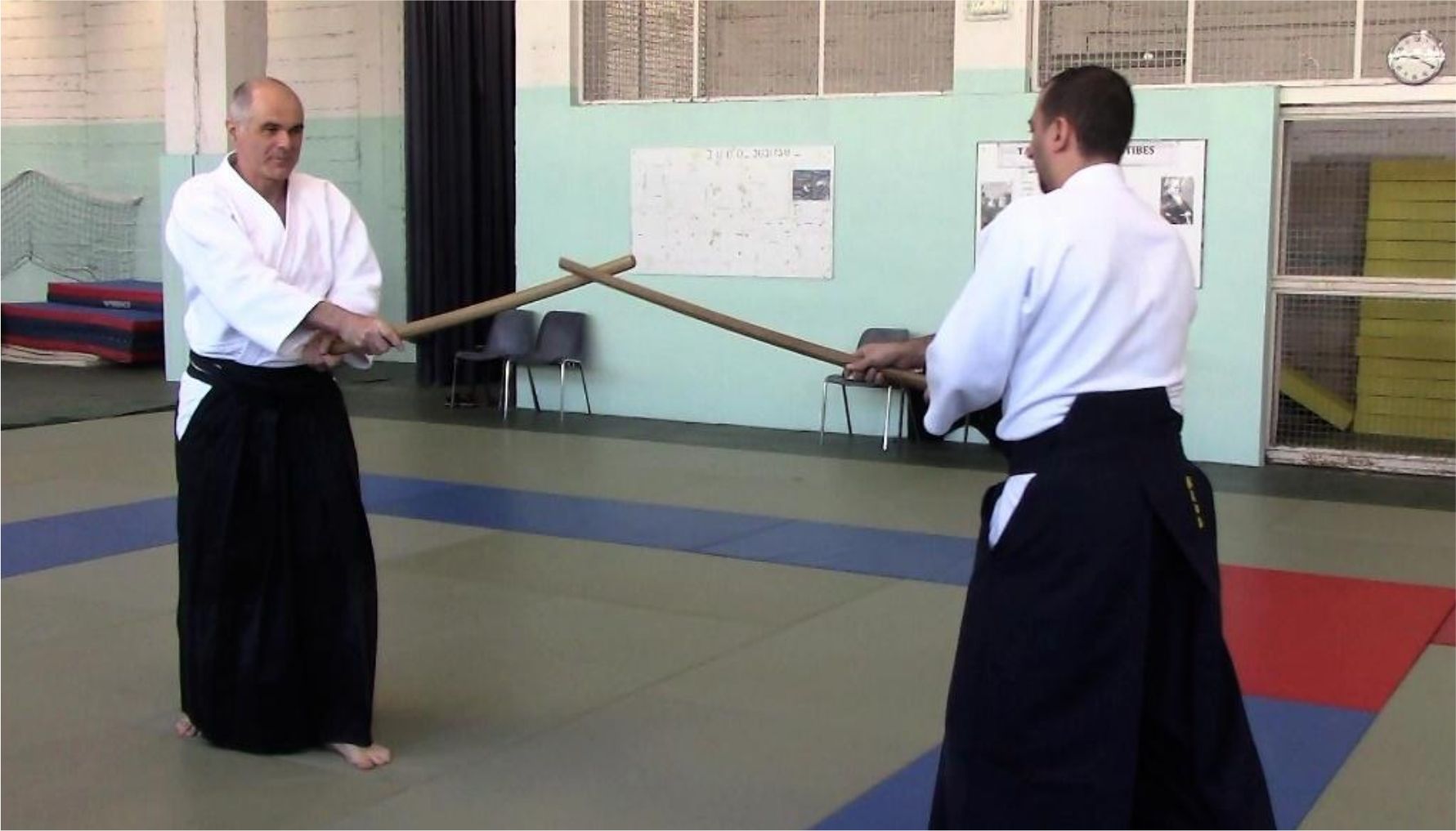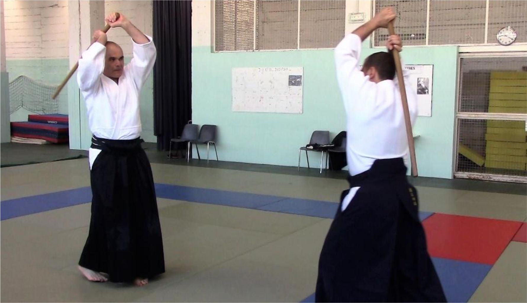 Dans le premier temps, uchi tachi attaque uke tachi avec yokomen, et celui-ci répond avec shomen :