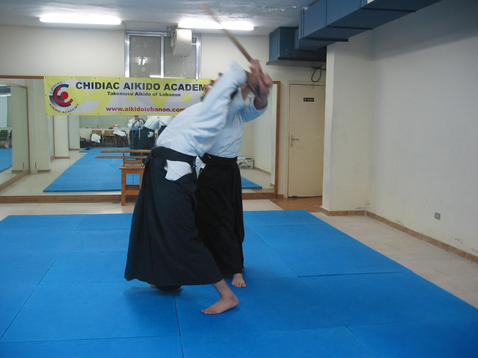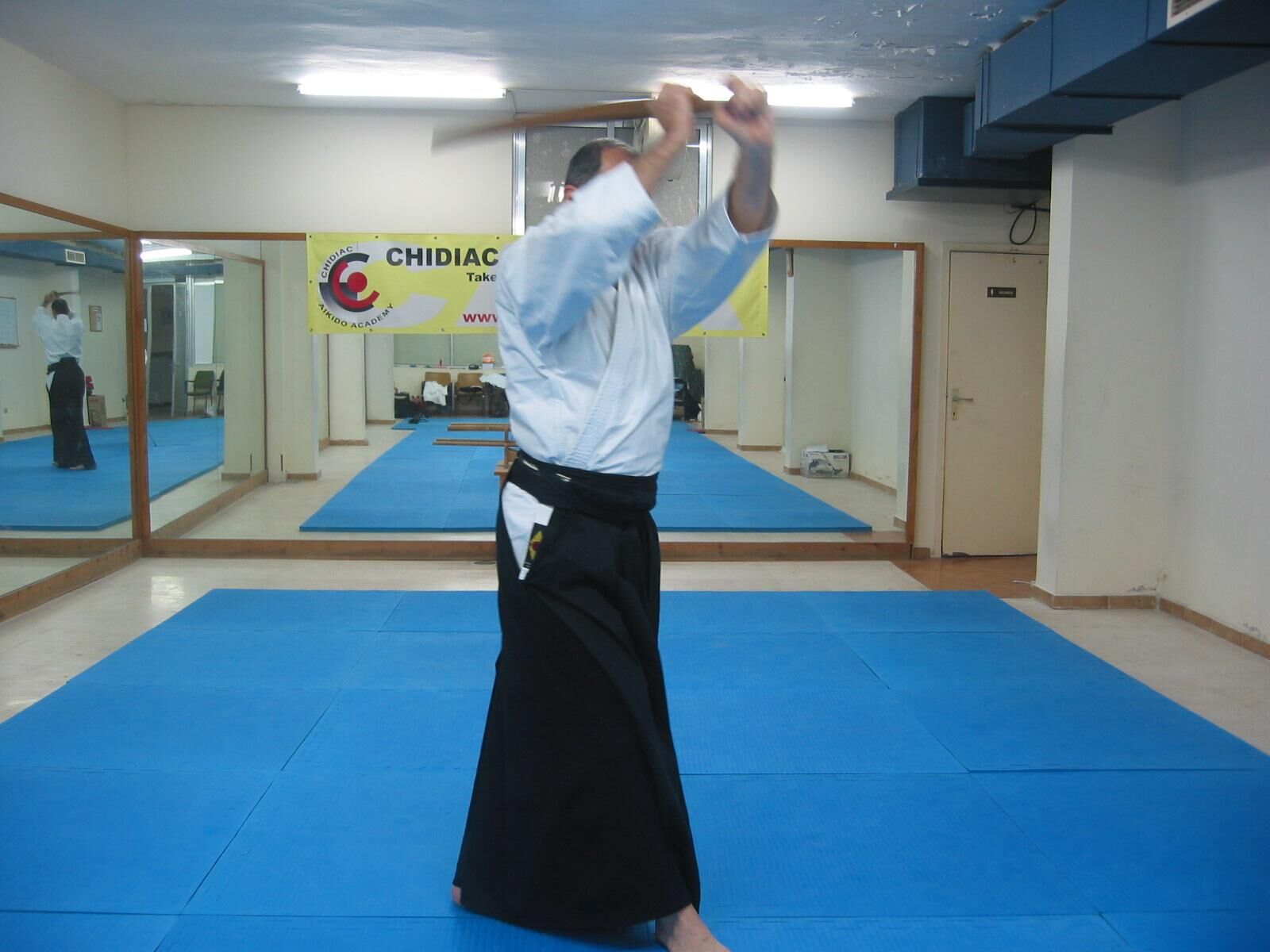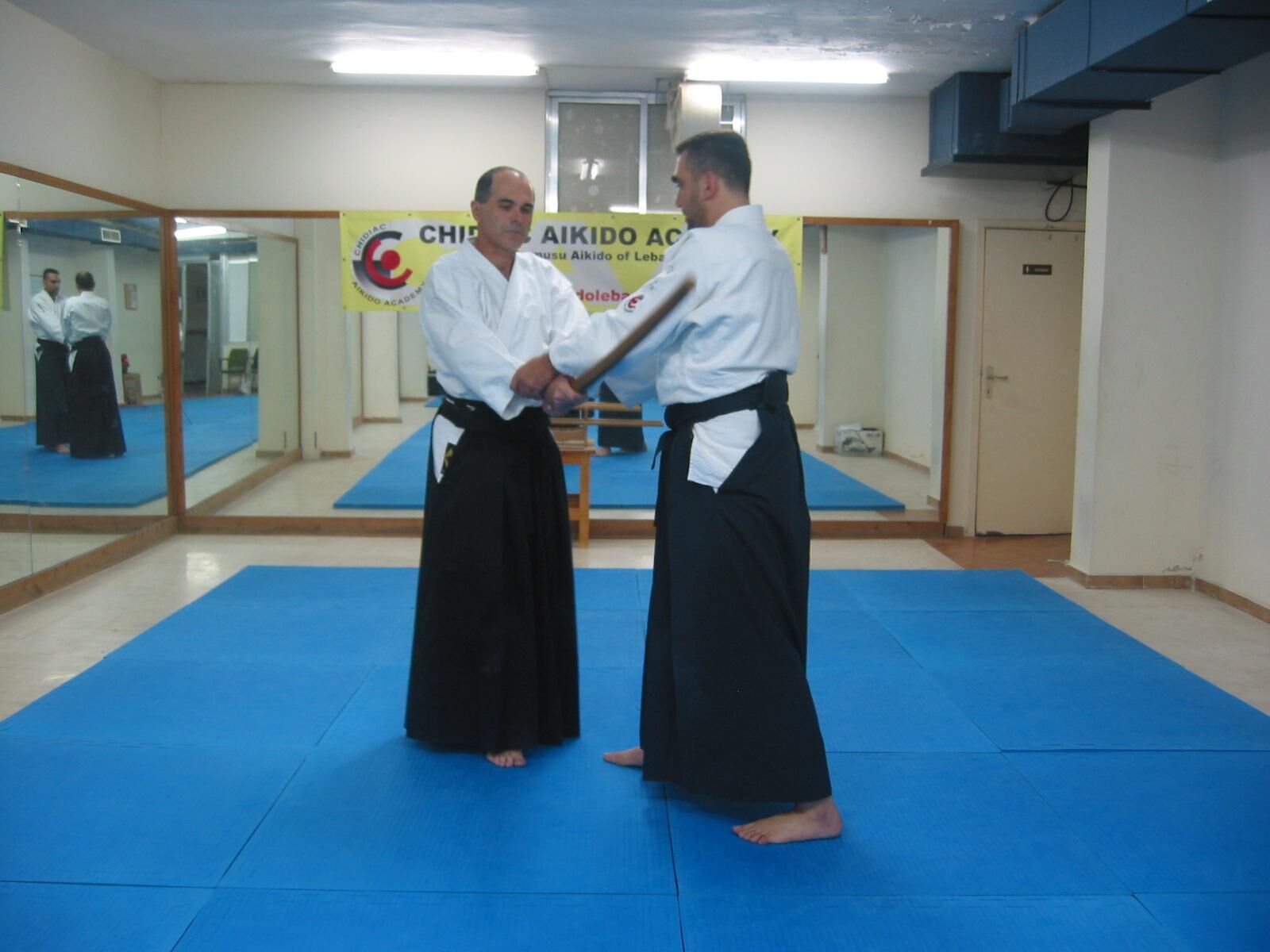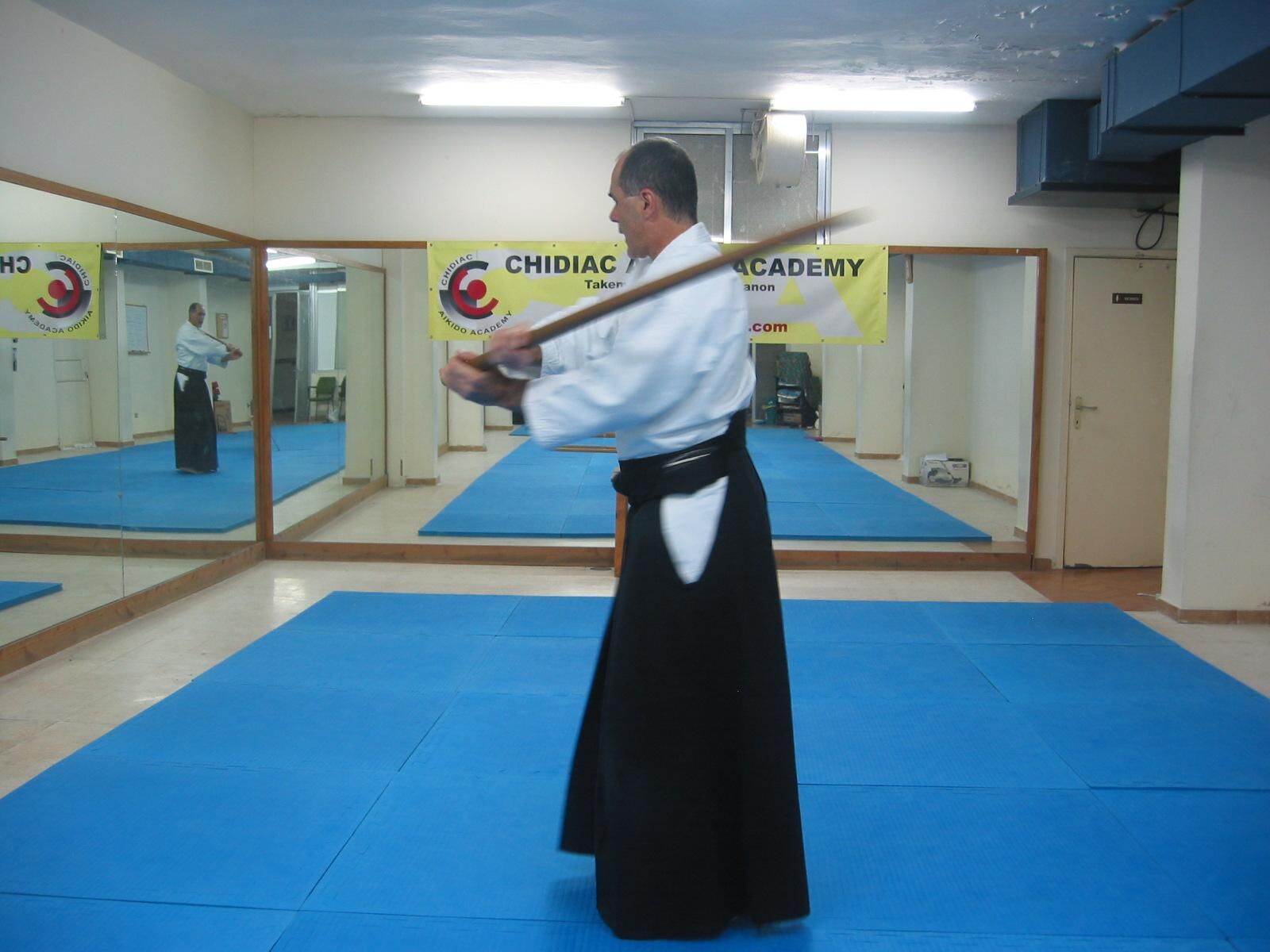 Pivotez à 180° avec un grand pas de la jambe droite vers l’arrière (tenkan), et coupez l’adversaire qui arrive dans votre dos.