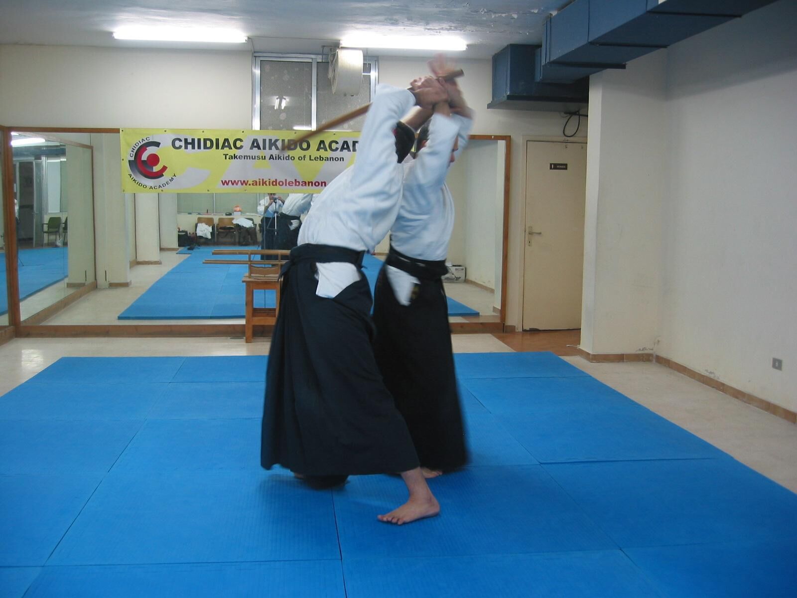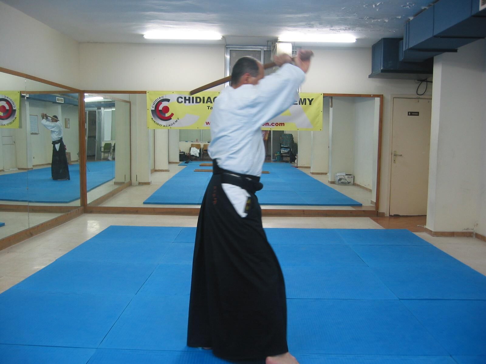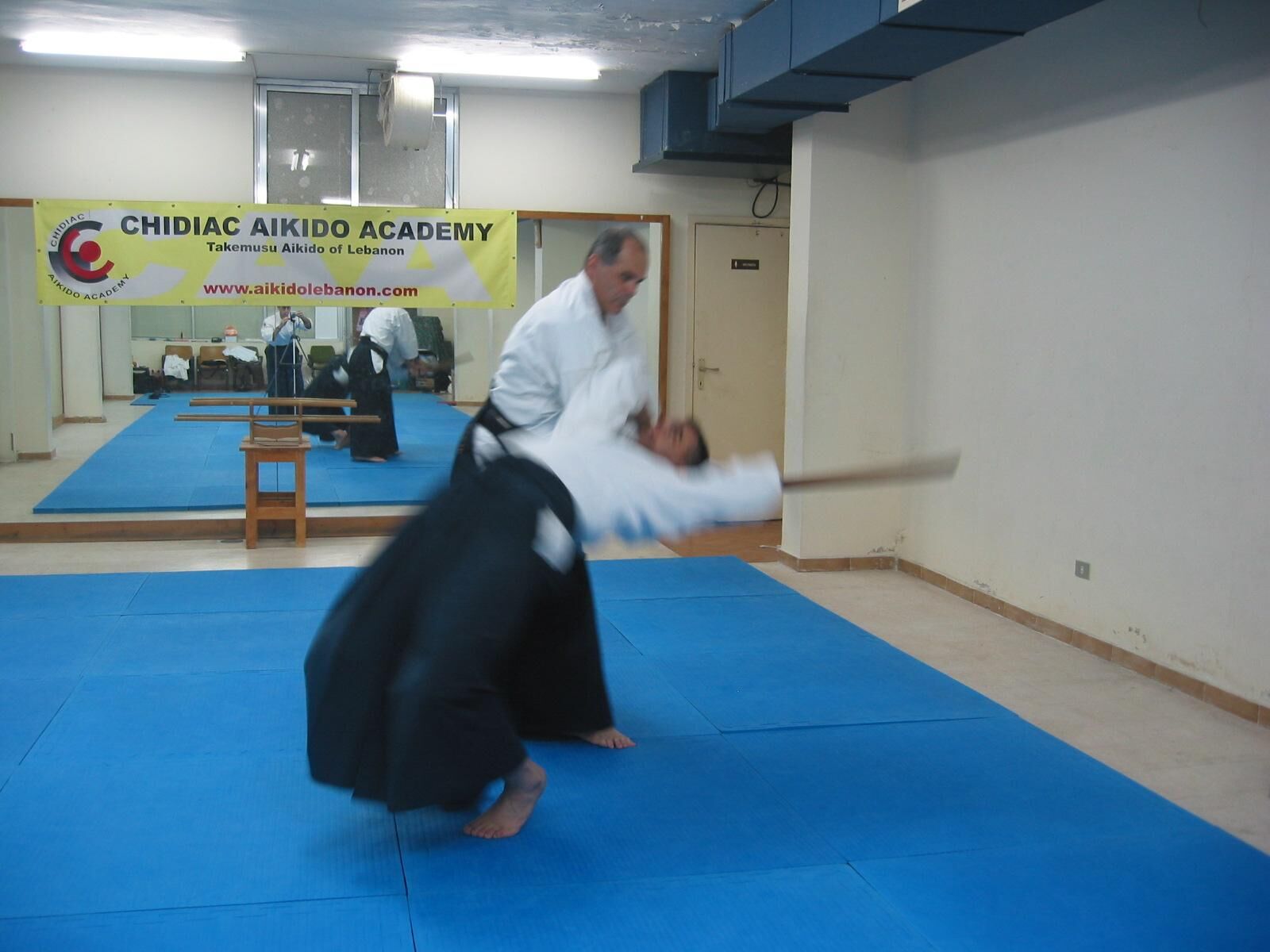 Pivotez à 180° avec un grand pas de la jambe droite vers l’arrière (tenkan), et coupez l’adversaire qui arrive dans votre dos.