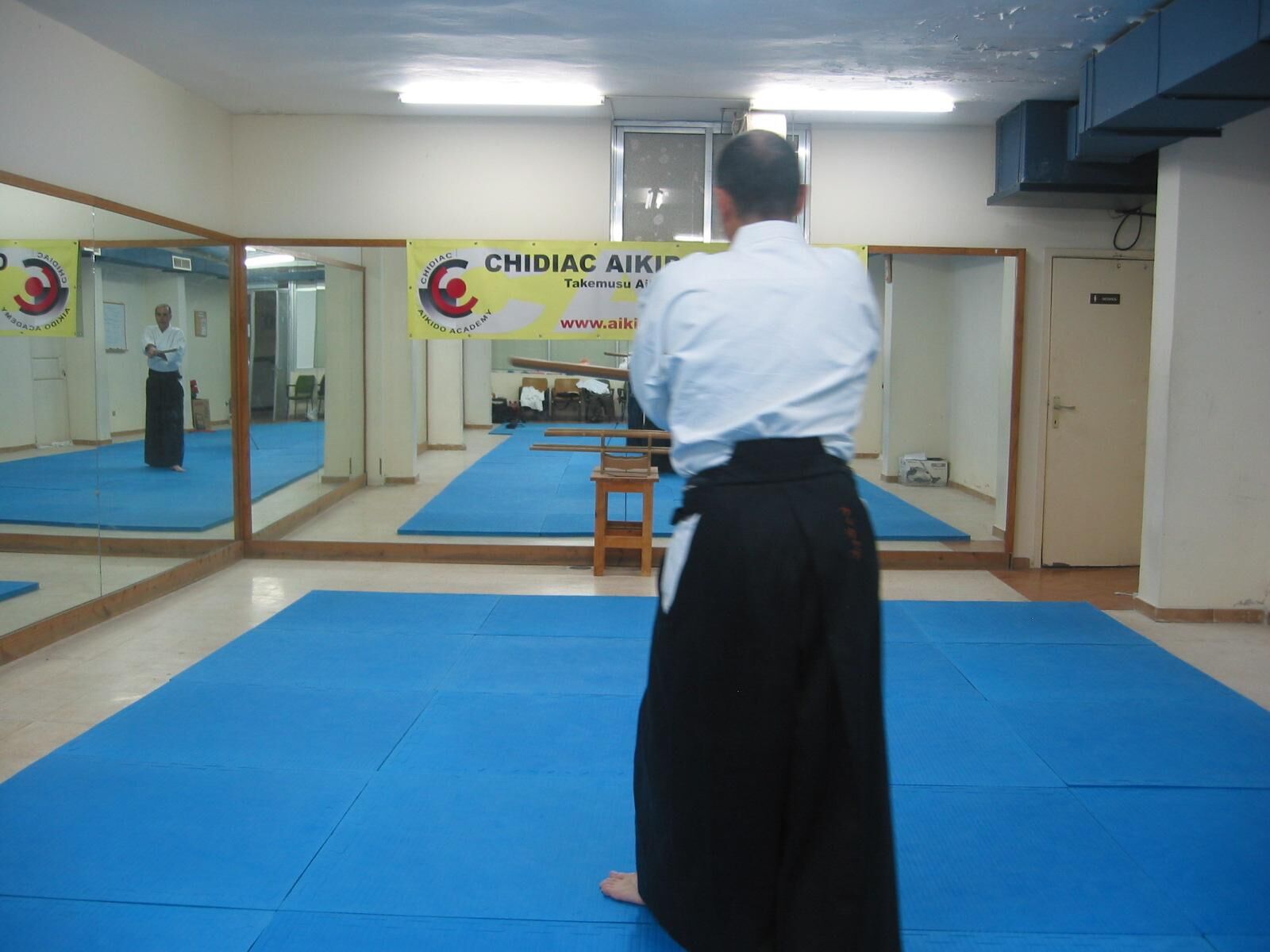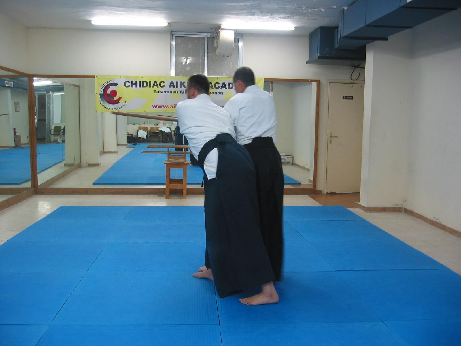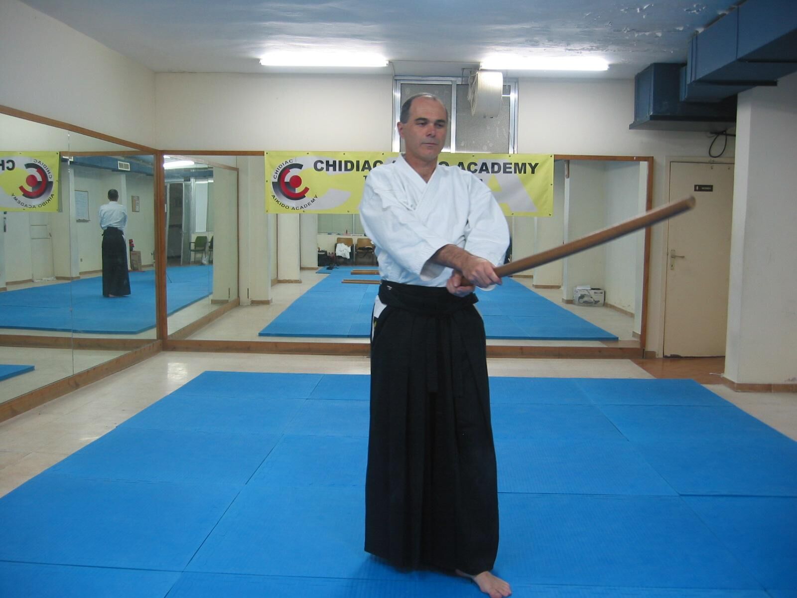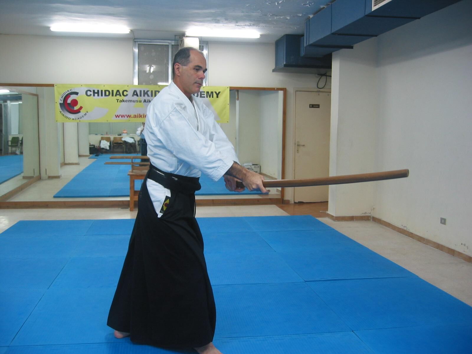 Pivotez à 180° avec un grand pas de la jambe droite vers l’arrière (tenkan), et coupez l’adversaire qui arrive dans votre dos.