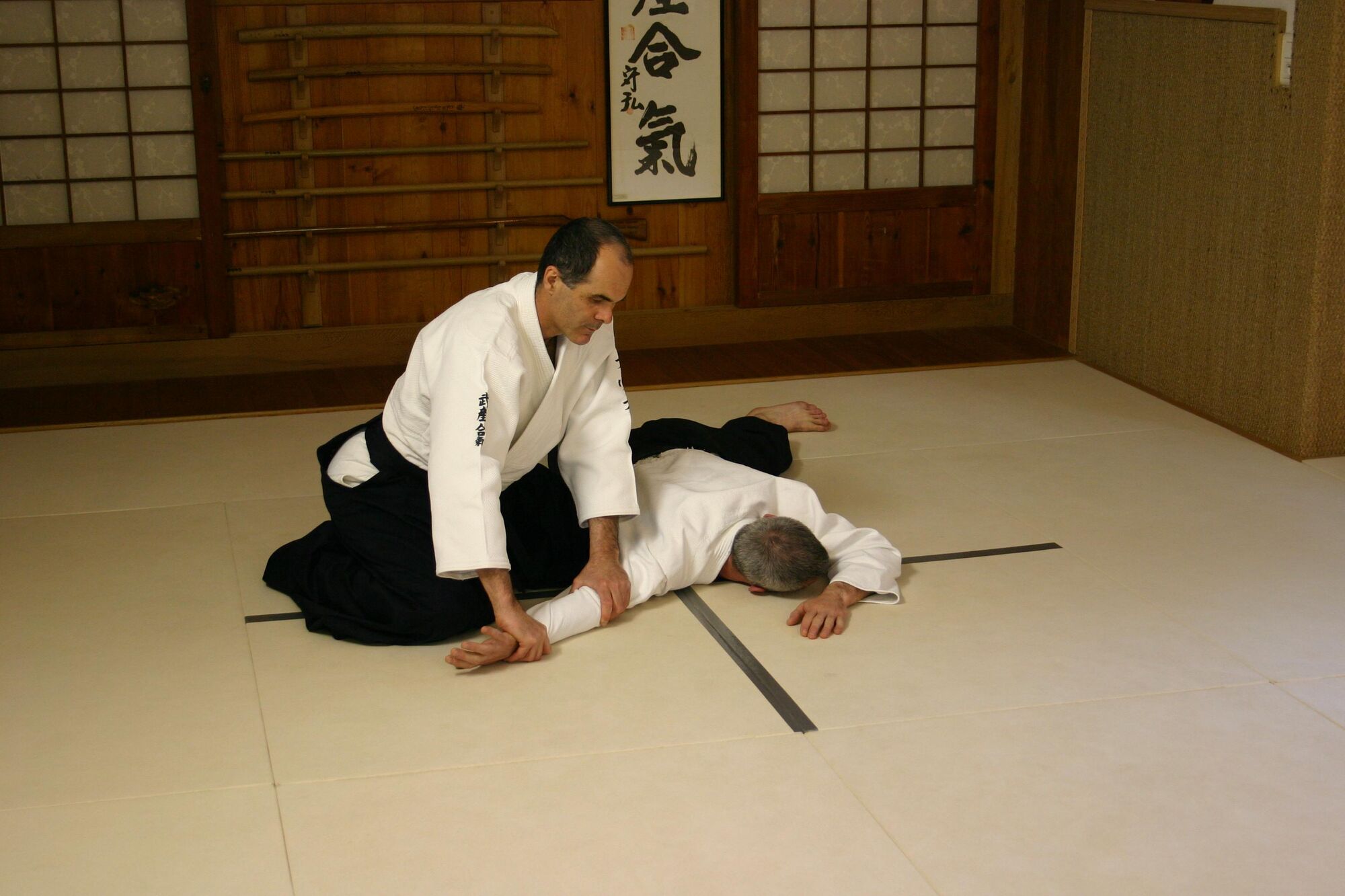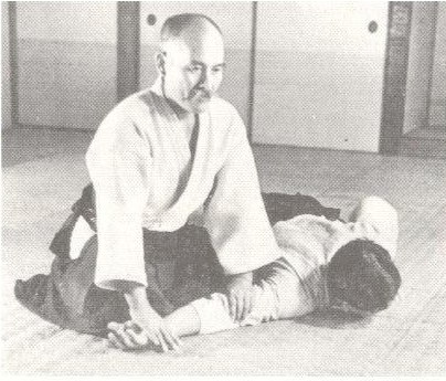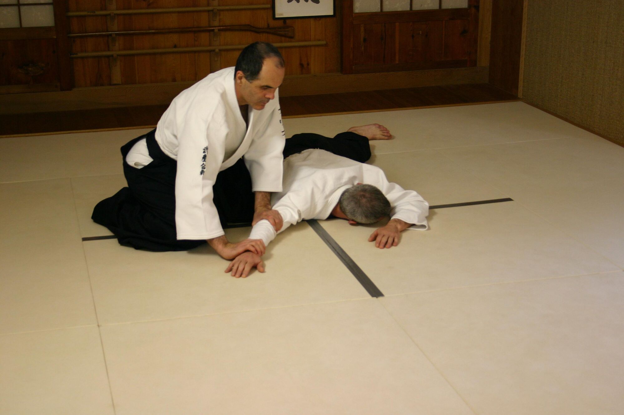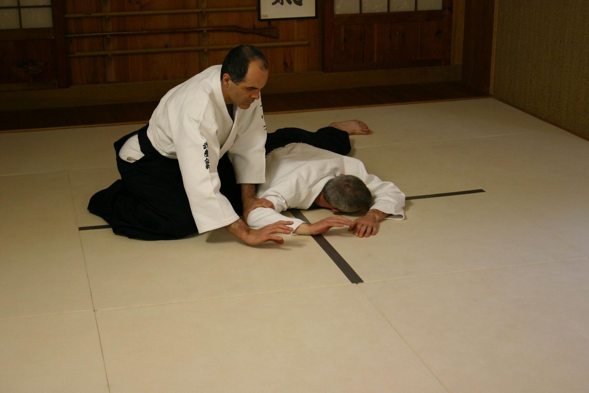 Si cet angle est respecté, alors tout le corps d’uke est contrôlé avec la seule main qui tient le coude, et il est possible de frapper la tête avec l’autre main comme démontré ci-dessus.