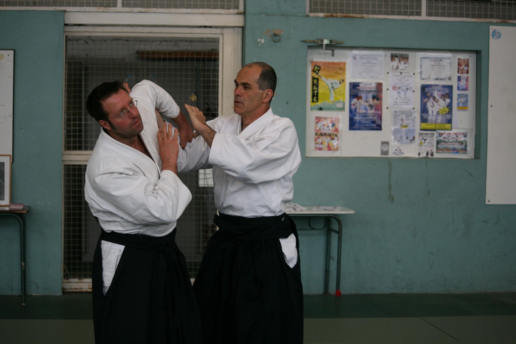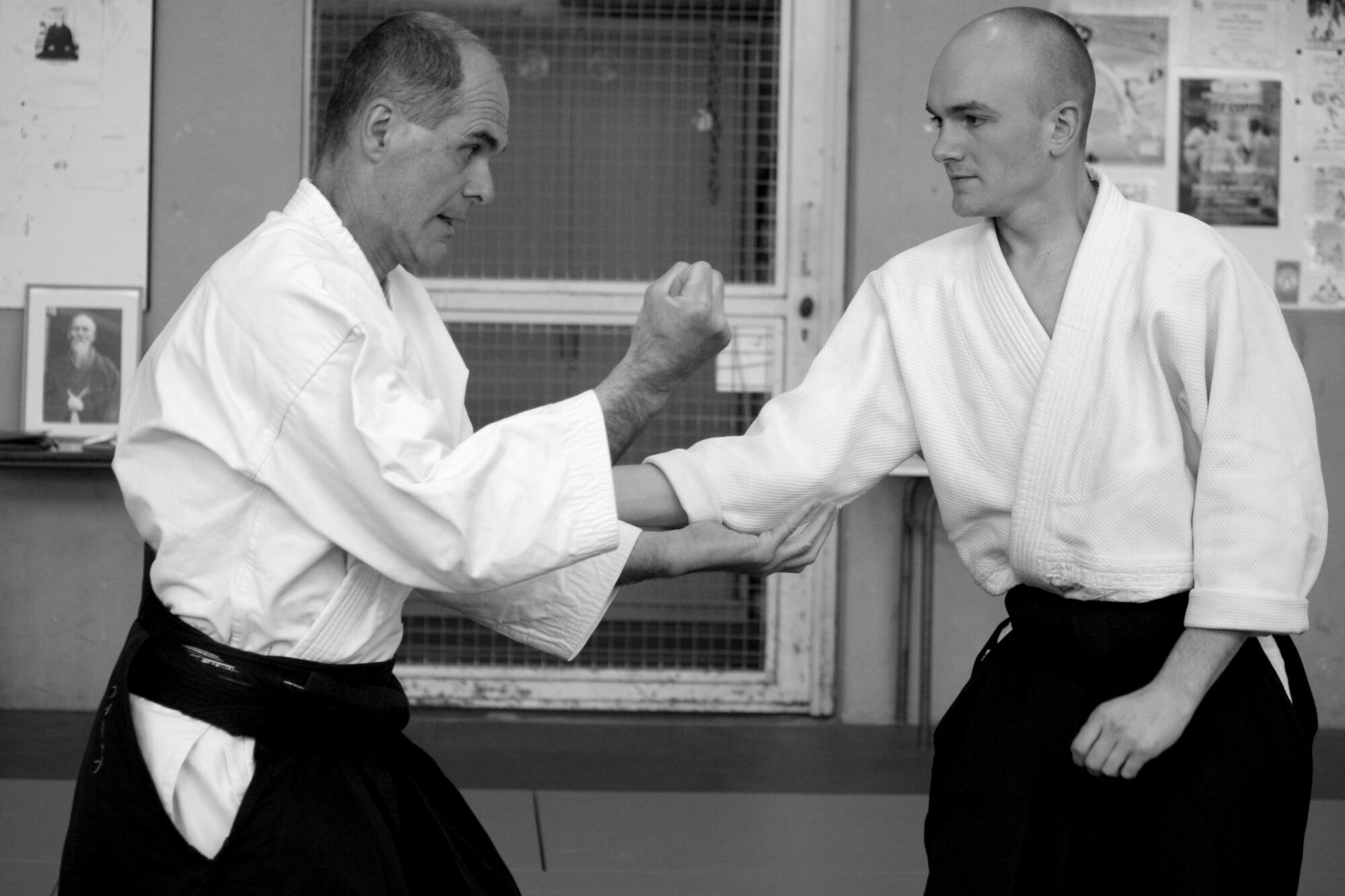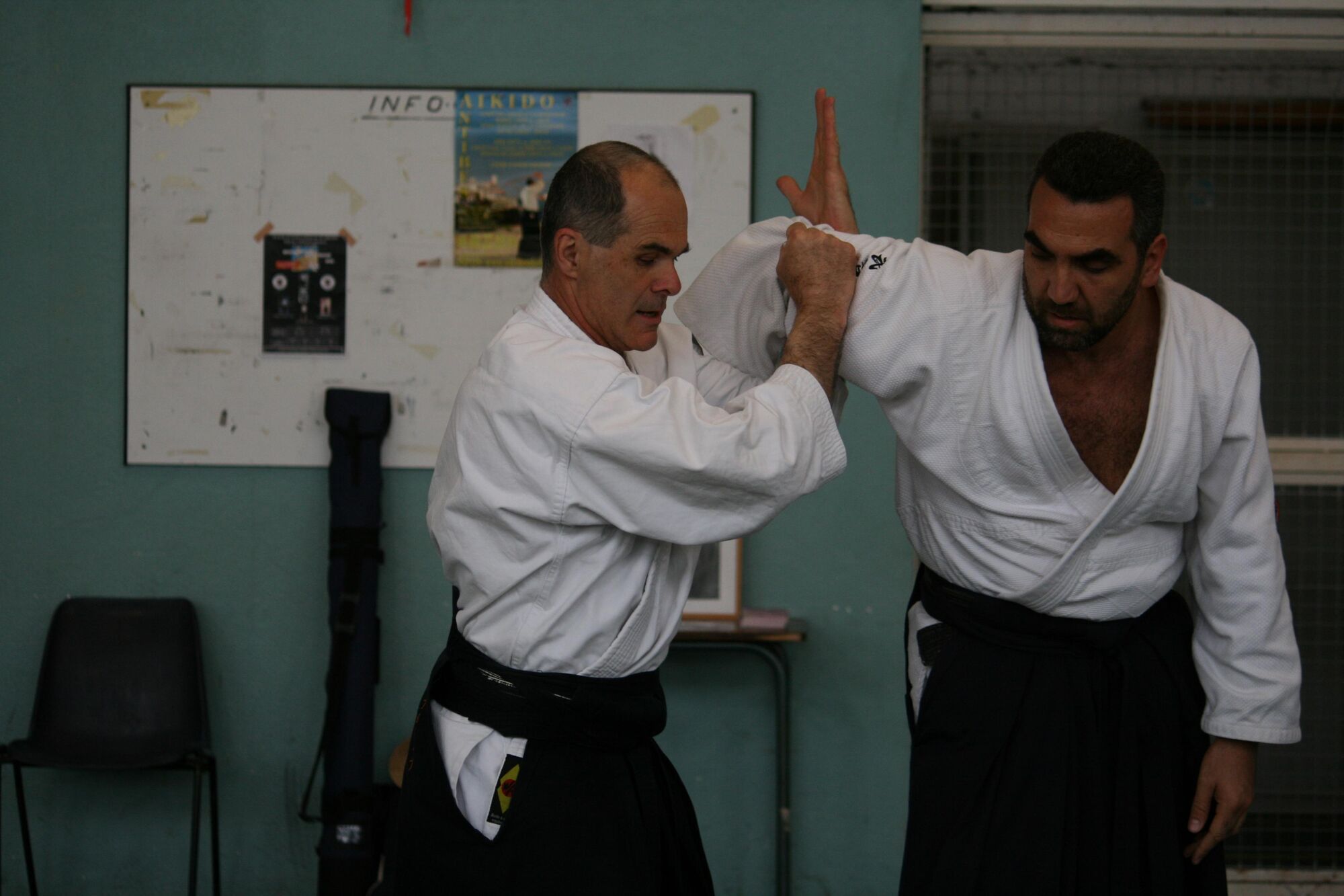 Trois choses sont à faire simultanément : glisser sur le côté hors de la ligne d’attaque, amener la main sous le coude d’uke et frapper avec l’autre main.