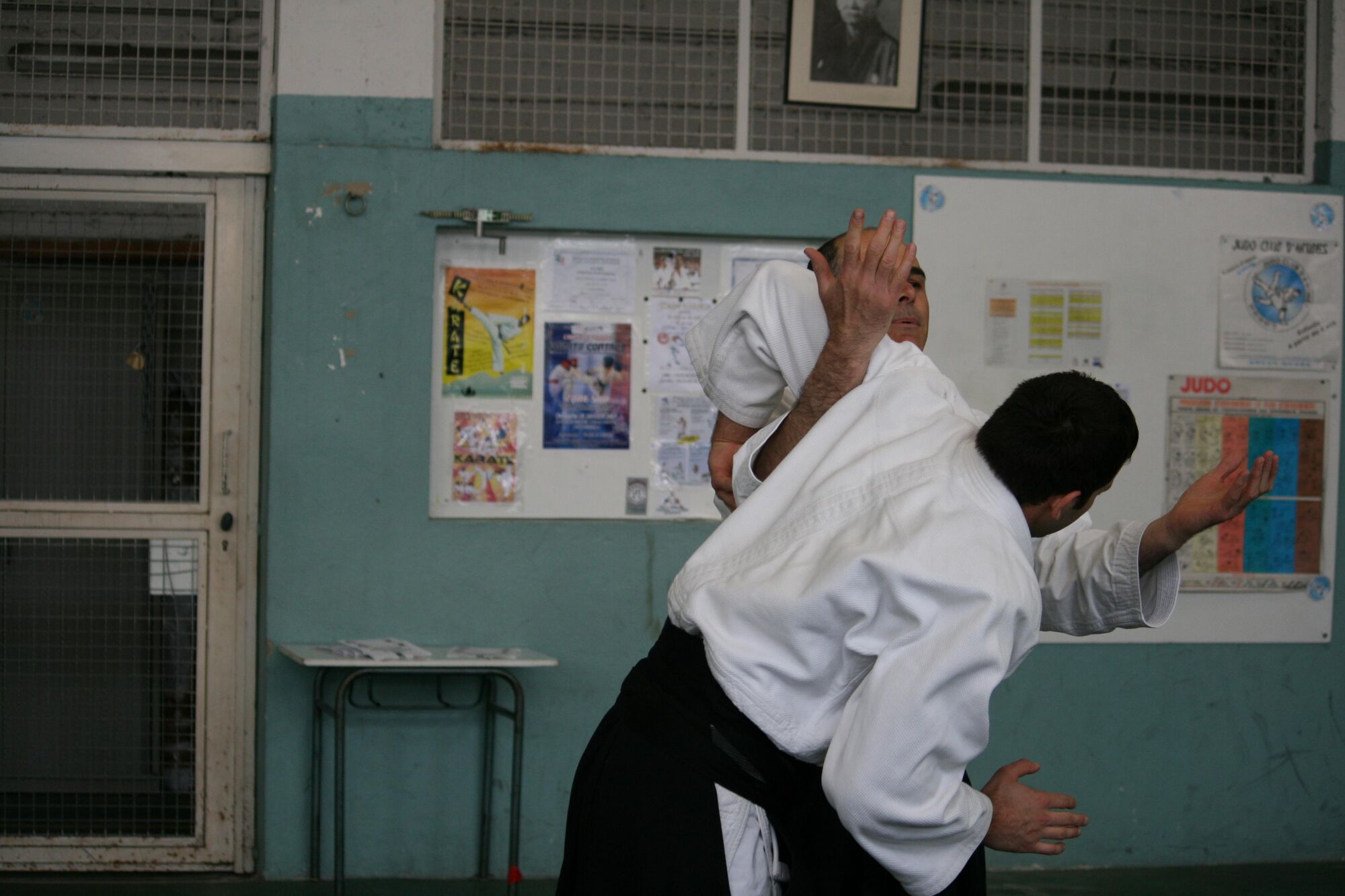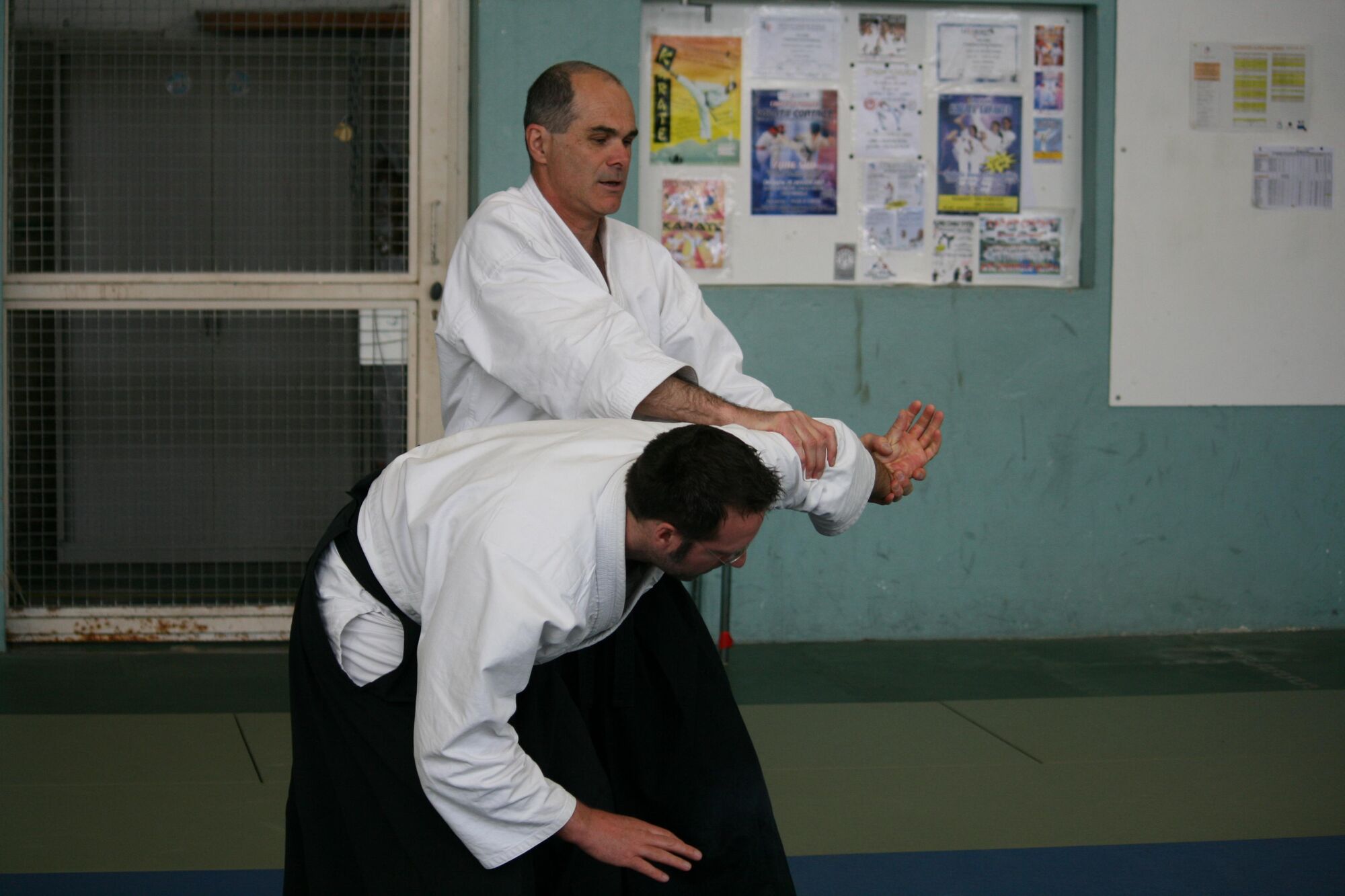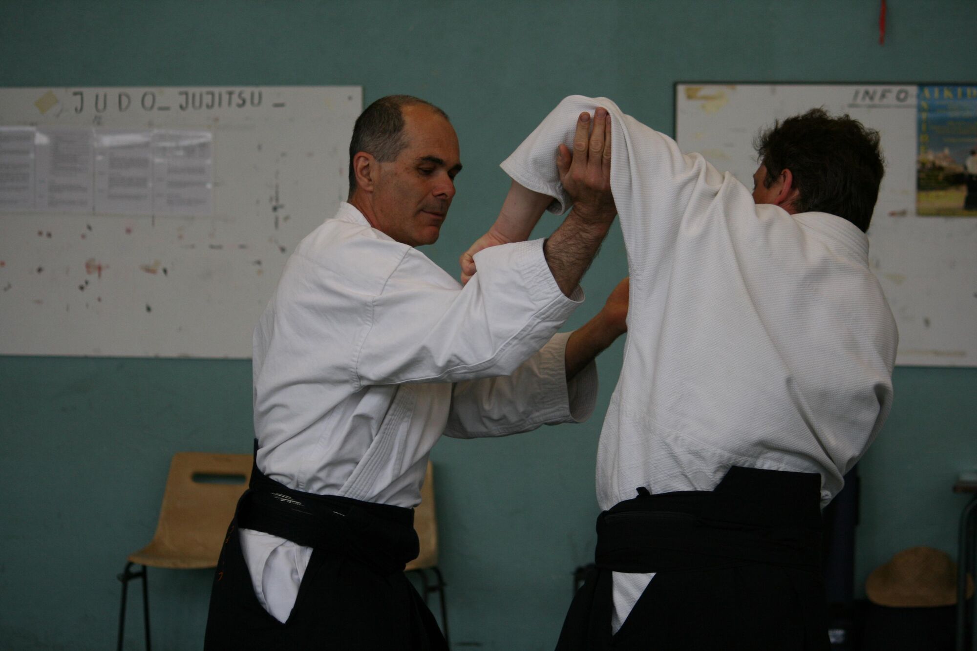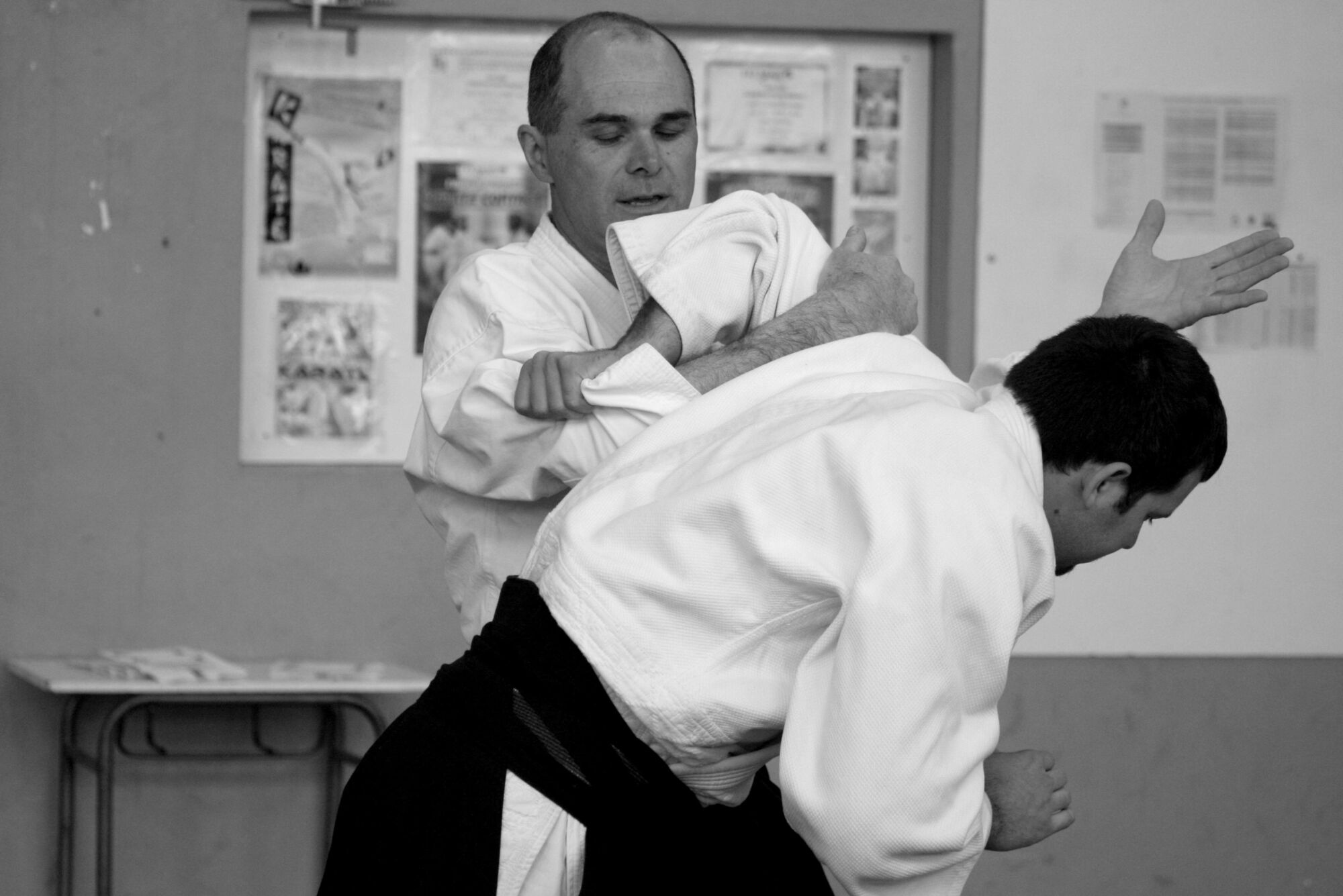 … votre mouvement d’enveloppement aboutira à engluer le bras d’uke contre votre thorax et vous pourrez l’amener directement au sol dans cette immobilisation sans passer par un contrôle du coude.