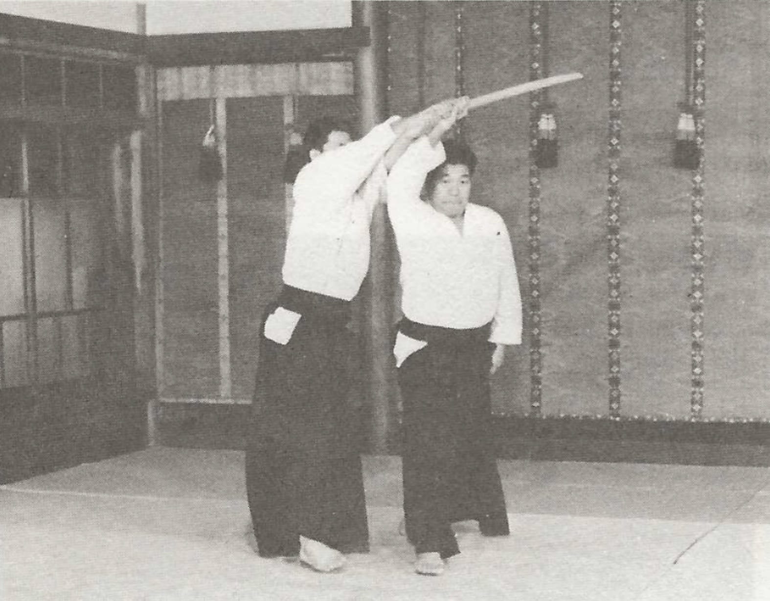 Dès le moment de la saisie, l’avant-bras droit d’uke tachi passe sous l’avant-bras gauche d’uchi tachi, et le soulève du sol par projection du ki vers le ciel :